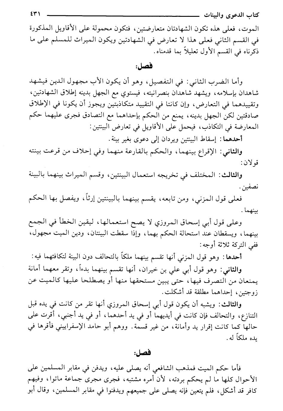 الموت، فعلى هذا تكون الشهادتان متعارضتين، فتكون محمولة على الأقاويل المذكورة في القسم الثاني. فعلى هذا لا تعارض في الشهادتين ويكون الميراث للمسلم على ما ذكرناه في القسم الأول، تعليلًا بما قدمناه.