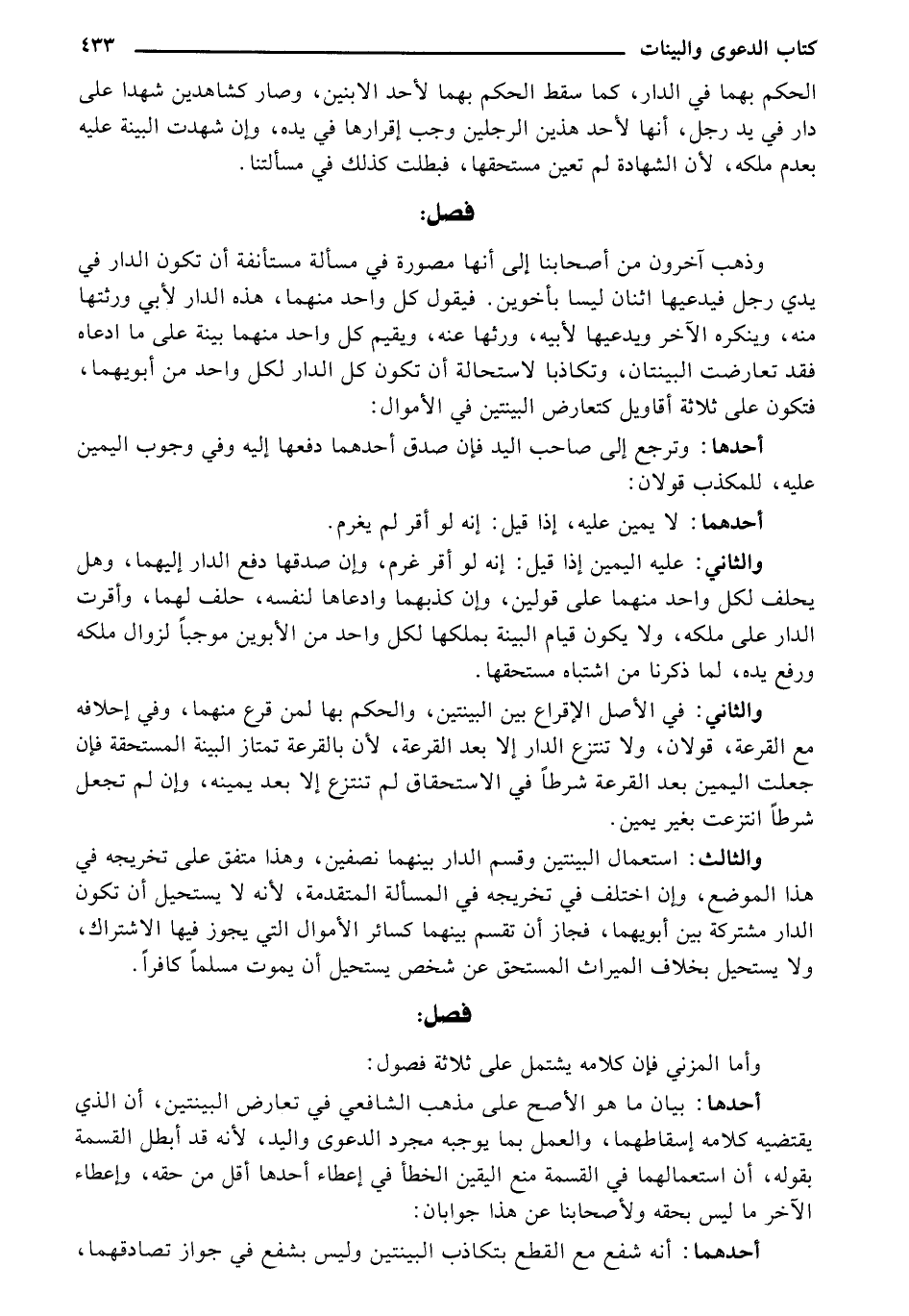 وذهب آخرون من أصحابنا إلى أنها مصورةً في مسألة مستأنفةً، أن تكون الدار في يدي رجل، فيدعيها اثنان ليسا بأخوين، فيقول كل واحد منهما، هذه الدار لأبي ورثتها منه، وينكره الآخر ويدعيها لأبيه، ورثها عنه، ويقيم كل واحد منهما بينة على ما ادعاه فقد تعارضت البينتان، وتكاذبا لاستحالة أن تكون كل الدار لكل واحد من أبويهما، فتكون على ثلاثة أقاويل كتعارض البينتين في الأموال: