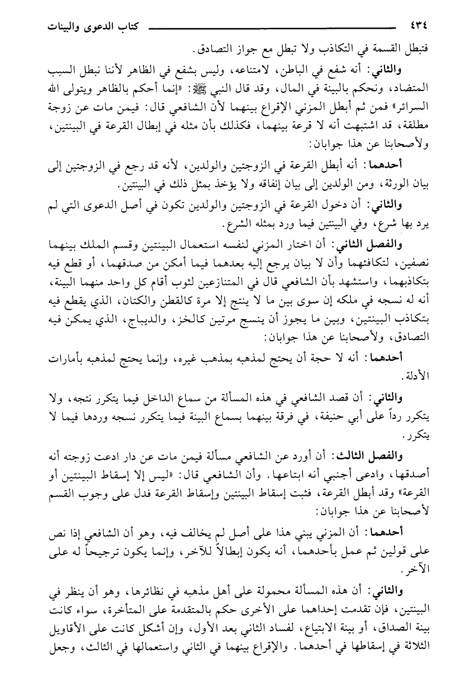 والفصل الثالث: أن أورد عن الشافعي مسألة فيمن مات عن دار ادعت زوجته أنه أصدقها، وادعى أجنبي أنه ابتاعها، وأن الشافعي قال: "ليس إلا إسقاط البينتين، أو القرعة" وقد أبطل القرعة، فثبت إسقاط البينتين وإسقاط القرعة، فدل على وجوب القسم ولأصحابنا عن هذا جوابان: