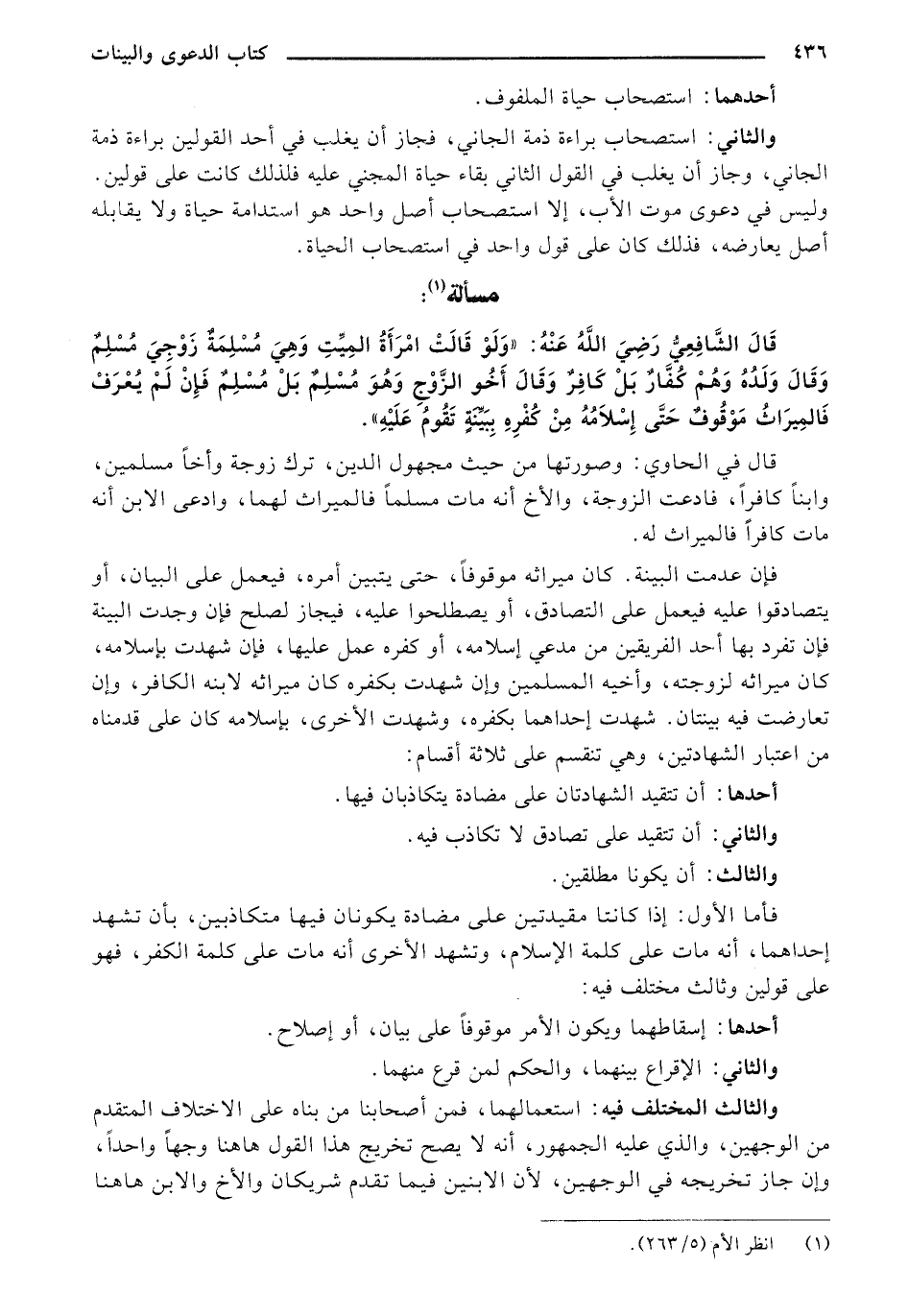 قال الشافعي رضي الله عنه: "ولو قالت امرأةً الميت وهي مسلمة زوجي مسلم وقال ولده وهم كفار بل كافر وقال أخو الزوج وهو مسلم بل مسلم، فإن لم يعرف، فالميراث موقوف حتى يعرف إسلامه من كفره ببينة تقوم عليه".