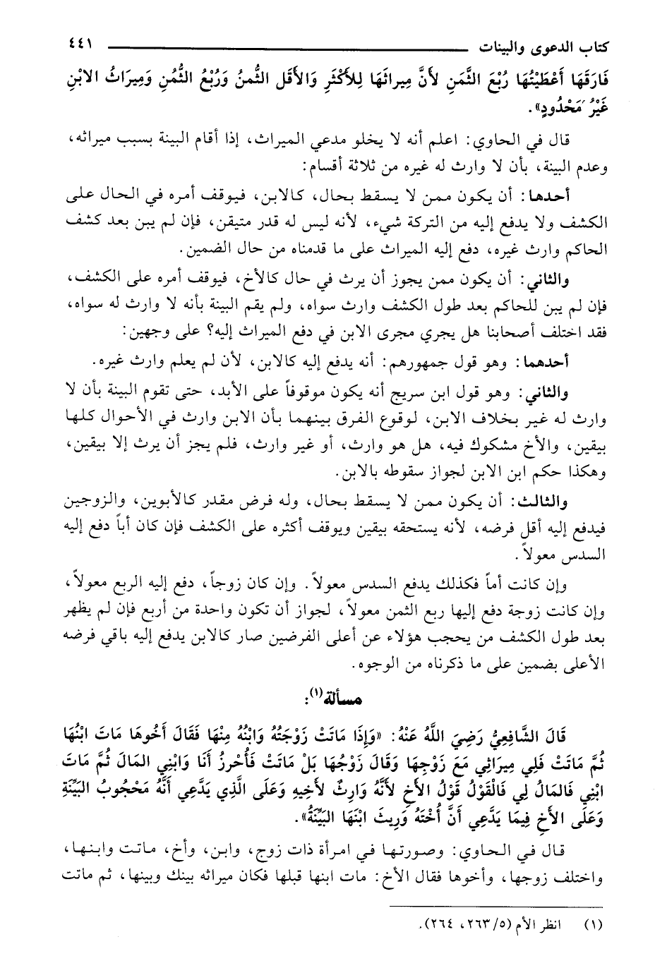 قال الشافعي رضي الله عنه: "وإذا ماتت زوجته وابنه منها فقال أخوها مات ابنها ثم ماتت فلي ميراثي مع زوجها وقال زوجها بل ماتت فأحرز أنا وابني المال ثم مات ابني فالمال لي فالقول قول الأخ لأنه وارث لأخيه وعلى الذي يدعي أنه محجوب البينة وعلى الأخ فيما يدعي أن أخته وريث ابنها البينة".