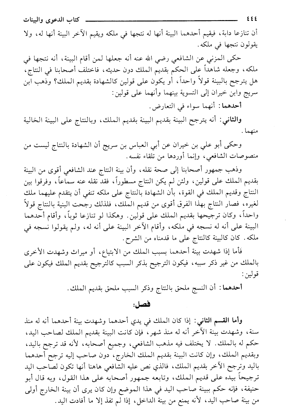 وذهب جمهور أصحابنا إلى صحة نقله، وأن بينة النتاج عند الشافعي أقوى من البينة بقديم الملك على قولين، ولئن لم يكن النتاج مسطوراً، فقد نقله عنه سماعاً، وفرقوا بين النتاج وقديم الملك في القوة، بأن الشهادة بالنتاج على ملكه تنفي أن يتقدم عليهما ملك لغيره، فصار النتاج بهذا الفرق أقوى من قديم الملك، فلذلك رجحت البينة بالنتاج قولاً واحداً، وكان ترجيحها بقديم الملك على قولين. وهكذا لو تنازعا ثوباً، وأقام أحدهما البينة على أنه له نسجه في ملكه، وأقام الآخر البينة على أنه له، ولم يقولوا نسجه في ملكه. كان كالبينة كالنتاج على ما قدمناه من الشرح.