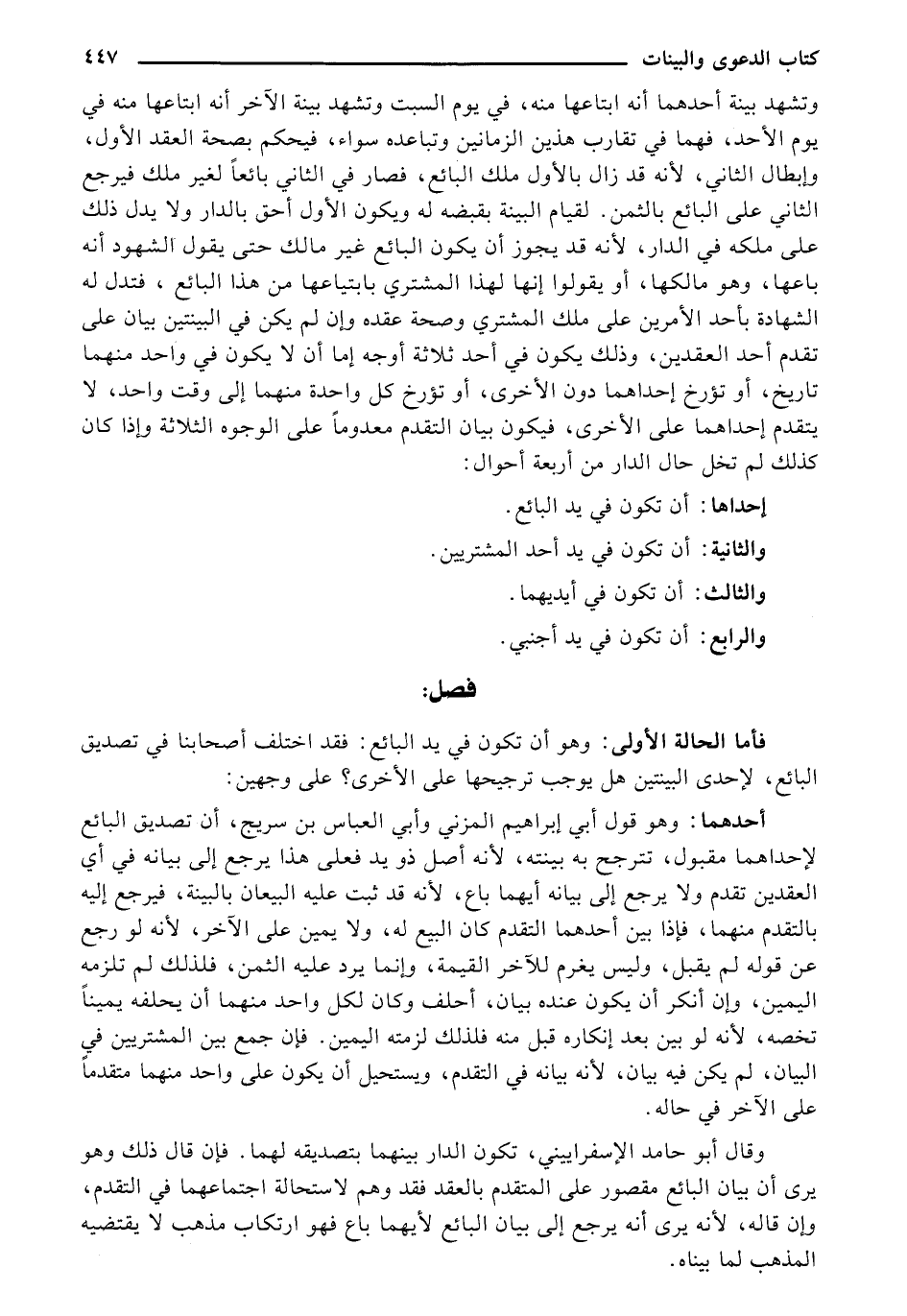 وتشهد بينة أحدهما أنه ابتاعها منه، في يوم السبت وتشهد بينة الآخر أنه ابتاعها منه في يوم الأحد، فهما في تقارب هذين الزمانين وتباعده سواء، فيحكم بصحة العقد الأول، وإبطال الثاني، لأنه قد زال بالأول ملك البائع، فصار في الثاني بائعاً لغير ملك فيرجع الثاني على البائع بالثمن. لقيام البينة بقبضه له ويكون الأول أحق بالدار ولا يدل ذلك على ملكه في الدار، لأنه قد يجوز أن يكون البائع غير مالك حتى يقول الشهود أنه باعها، وهو مالكها، أو يقولوا إنها لهذا المشتري بابتياعها من هذا البائع، فتدل له الشهادة أحد الأمرين على ملك المشتري وصحة عقده وإن لم يكن في البينتين بيان على تقدم أحد العقدين، وذلك يكون في أحد ثلاثة أوجه إما أن لا يكون في واحد منهما تاريخ، أو تؤرخ أحدهما دون الأخرى، أو تؤرخ كل واحدة منهما إلى وقت واحد، لا يتقدم إحداهما على الأخرى، فيكون بيان التقدم معدوماً على الوجوه الثلاثة وإذا كان كذلك لم تخل حال الدار من أربعة أحوال: