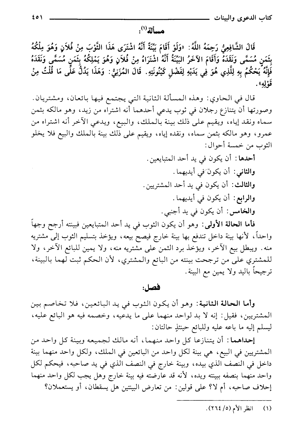 قال في الحاوي: وهذه المسألة الثانية التي يجتمع فيها بائعان، ومشتريان وصورتها أن يتنازع رجلان في ثوب يدعي أحدهما أنه اشتراه من زيد وهو مالكه بثمن سماه ونقد إياه، ويقيم على ذلك بينة بالملك والبيع ويدعي الآخر أنه اشتراه من عمرو، وهو مالكه بثمن سماه، ونقده إياه، ويقيم على ذلك بينة بالملك والبيع فلا يخلو الثوب من خمسة أحوال: