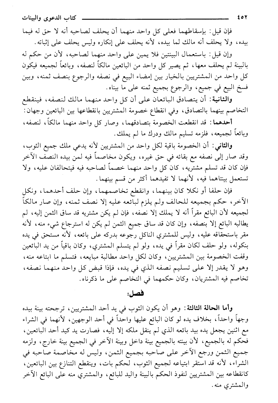 والثاني: أن الخصومة باقية لكل واحد من المشتريين لأنه يدعي ملك جميع الثوب، وقد صار إلى نصفه مع بقائه في حق غيره، ويكون مخاصماً فيه لمن بيده النصف الآخر فإن كان قد تسلم مشتريه كان كل واحد منهما خصماً لصاحبه فيه فيتحالفان عليه، ولا تستعمل بيناهما فيه، لأنهما لا تفيدهما أكثر من قسم بينهما.
