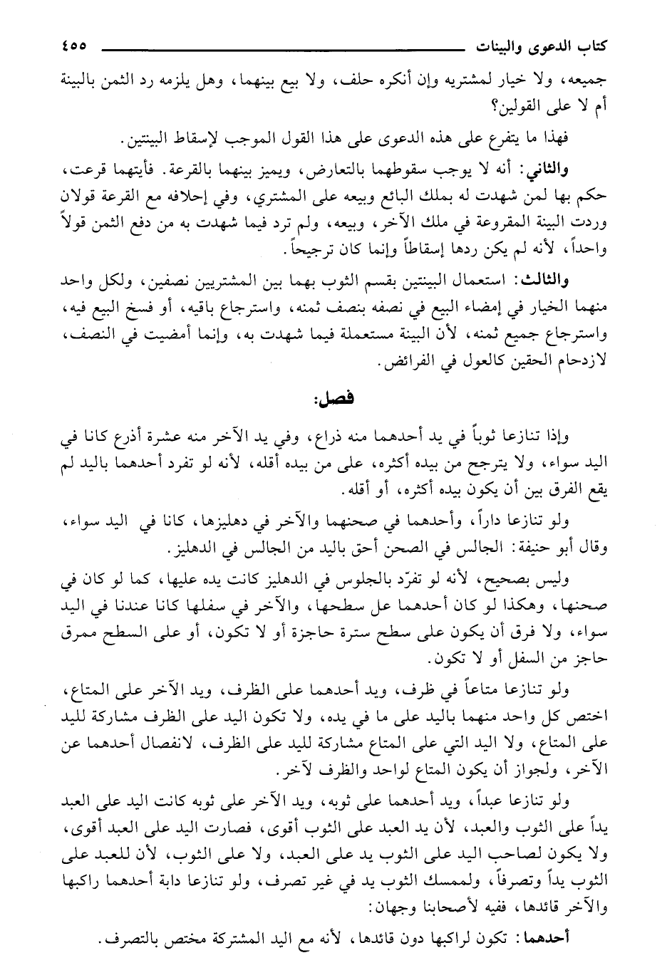 وإذا تنازعا ثوباً في يد؟ أحدهما منه ذراع، وفي يد الآخر منه عشرة أذرع كانا في اليد سواء، ولا يترجح من بيده أكثره، على من بيده أقله، لأنه لو تفرد أحدهما باليد لم يقع الفرق بين أن يكون بيده أكثره أو أقله.