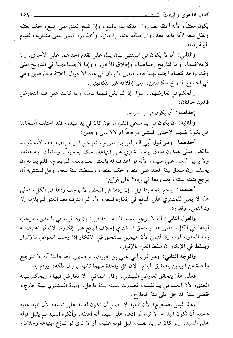 والثاني: أن لا يكون في البينتين بيان يدل على تقدم إحداهما على الأخرى إما لإطلاقهما وإما لتاريخ إحداهما، وإطلاق الأخرى وإما لاجتماعهما في التاريخ على وقت واحد فتضاد اجتماعهما فيه، فتصير البينتان في هذه الأحوال الثلاثة متعارضين وهي في اجتماع التاريخ متكاذبتين، وفي إطلاقه غير متكاذبتين. والحكم في تعارضهما، سواء إذا لم يكن فيهما بيان، وإذا كانت على هذا التعارض فالعبد حالتان: