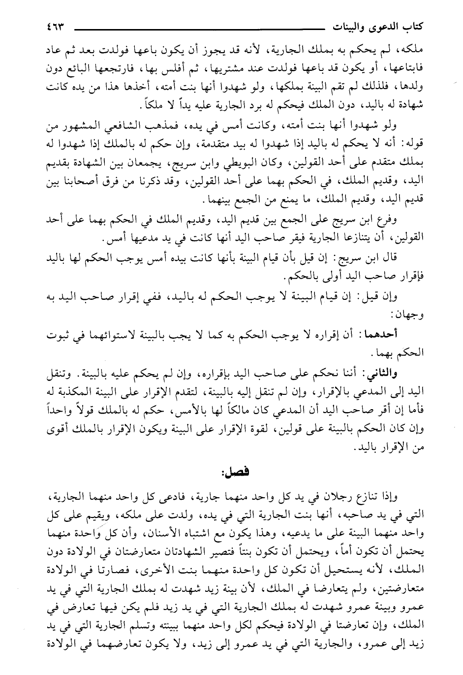 وإذا تنازع رجلان في يد كل واحد منهما جارية فادعى كل واحد منهما الجارية، التي في يد صاحبه، أنها بنت الجارية التي في يده ولدت على ملكه ويقيم على كل واحد منهما البينة على ما يدعيه وهذا يكون مع اشتباه الأسنان، وأن كل واحدة منهما يحتمل أن تكون أماً ويحتمل أن تكون بنتاً فتصير الشهادتان متعارضتان في الولادة دون الملك، لأنه يستحيل أن تكون كل واحدة منهما بنت الأخرى فصارتا في الولادة متعارضتين ولم يتعارضا في الملك، لأن بينة زيد شهدت له بملك الجارية التي في يد عمرو وبينة عمرو شهدت له بملك الجارية التي في يد زيد فلم يكن فيها تعارض في الملك وإن تعارضتا في الولادة فيحكم لكل واحد منهما ببينته وتسلم الجارية التي في يد زيد إلى عمرو والجارية التي في يد عمرو إلى زيد ولا يكون تعارضهما في الولادة