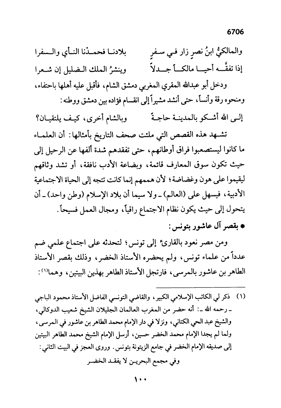 (¬1) ذكر لي الكاتب الإسلامي الكبير، والقاضي التونسي الفاضل الأستاذ محمود الباجي -رحمه الله-: أنه حضر من المغرب العالمان الجليلان الشيخ شعيب الدوكالي، والشيخ عبد الحي الكتاني، ونزلا في دار الإمام محمد الطاهر بن عاشور في المرسى، ولما لم يجدا الإمام محمد الخضر حسين، أرسل الإمام الشيخ محمد الطاهر البيتين إلى صديقه الإمام الخضر في جامع الزيتونة بتونس. وروى العجز في البيت الثاني: وفي مجمع البحرين لا يفقد الخضر