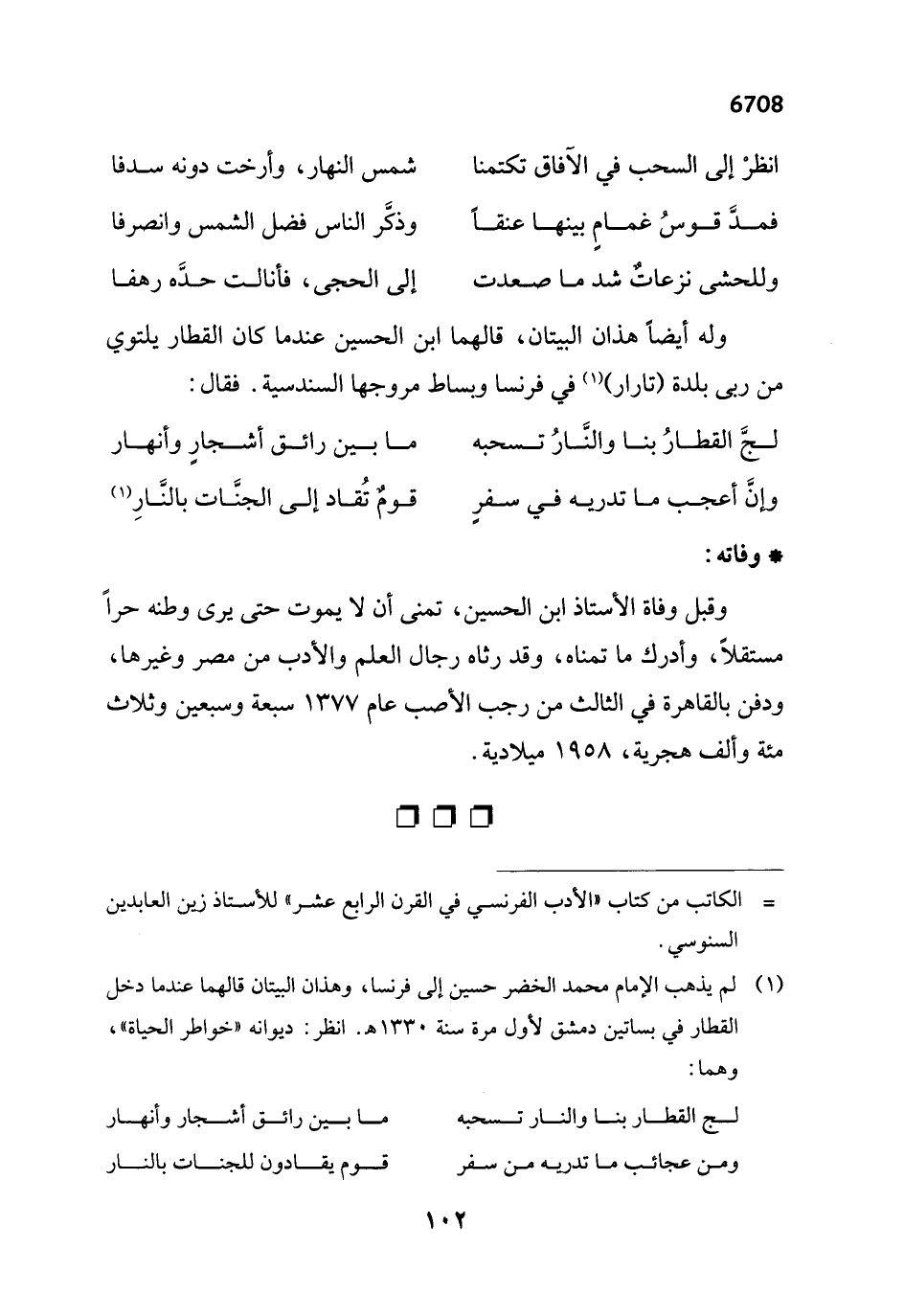 (¬1) لم يذهب الإمام محمد الخضر حسين إلى فرنسا، وهذان البيتان قالهما عندما دخل القطار في بساتين دمشق لأول مرة سنة 1330 هـ. انظر: ديوانه "خواطر الحياة"، وهما: