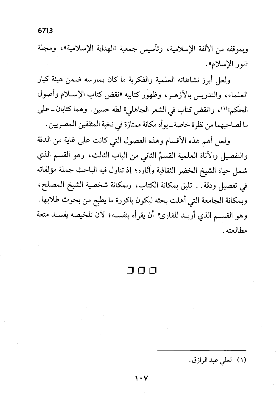 ولعل أبرز نشاطاته العلمية والفكرية ما كان يمارسه ضمن هيئة كبار العلماء، والتدريس بالأزهر، وظهور كتابيه وإنقض كتاب الإسلام وأصول الحكم" (¬1)، و"نقض كتاب في الشعر الجاهلي" لطه حسين. وهما كتابان -على ما لصاحبهما من نظرة خاصة- بوأه مكانة ممتازة في نخبة المثقفين المصريين.