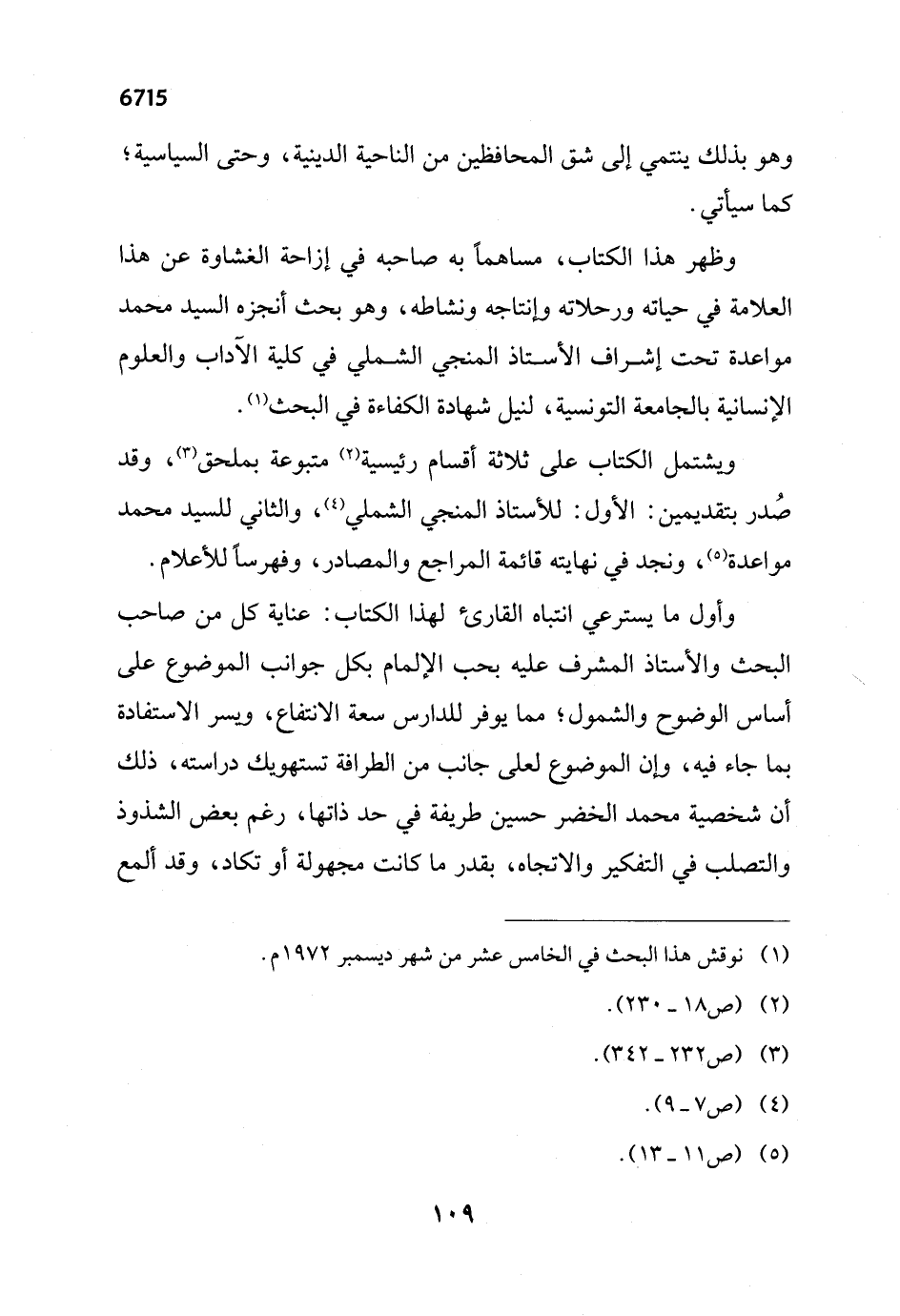 وأول ما يسترعي انتباه القارئ لهذا الكتاب: عناية كل من صاحب البحث والأستاذ المشرف عليه بحب الإلمام بكل جوانب الموضوع على أساس الوضوح والشمول؛ مما يوفر للدارس سعة الانتفاع، ويسر الاستفادة بما جاء فيه، وإن الموضوع لعلى جانب من الطرافة تستهويك دراسته، ذلك أن شخصية محمد الخضر حسين طريفة في حد ذاتها، رغم بعض الشذوذ والتصلب في التفكير والاتجاه، بقدر ما كانت مجهولة أو تكاد، وقد ألمع