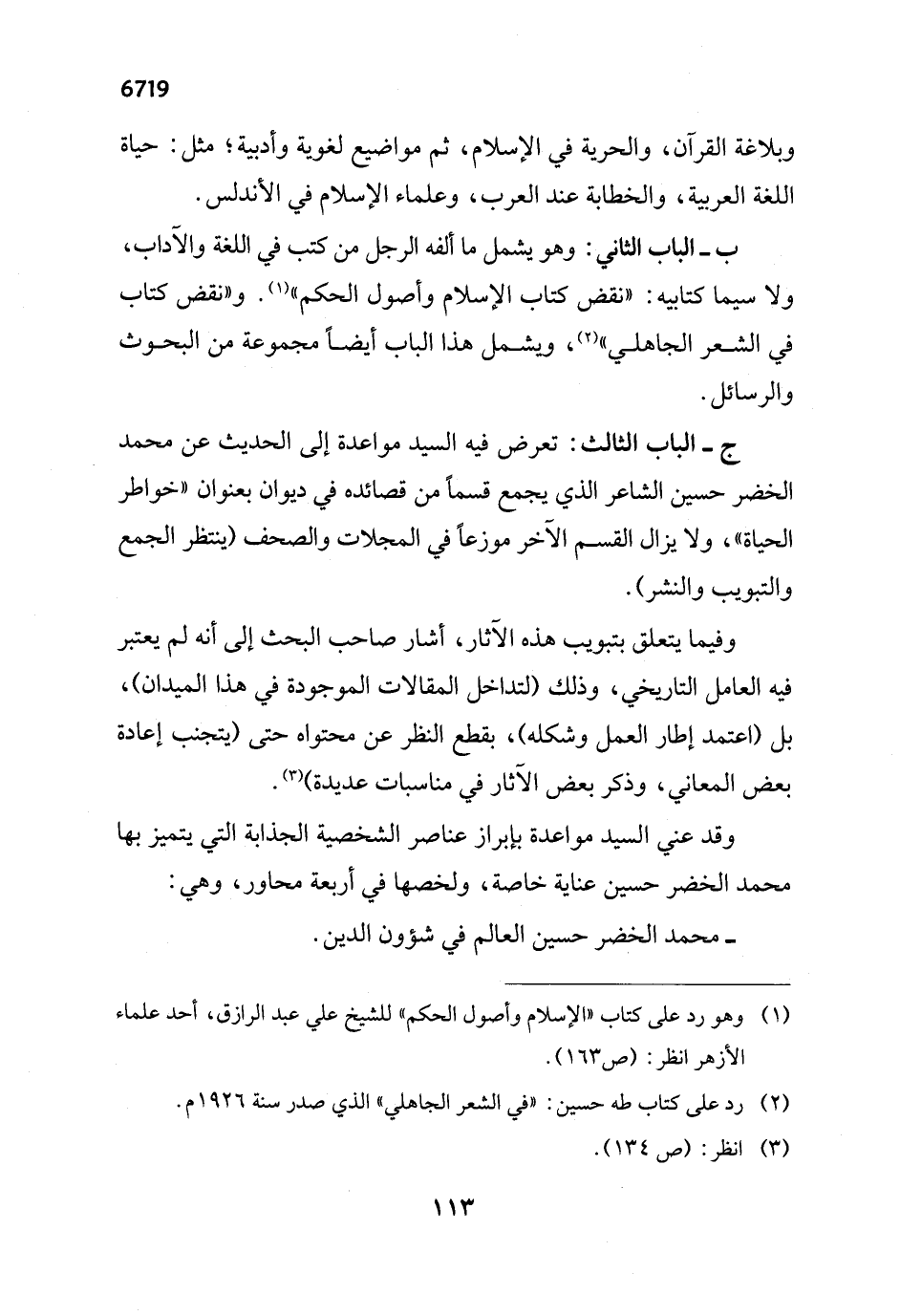 ب - الباب الثاني: وهو يشمل ما ألفه الرجل من كتب في اللغة والآداب، ولا سيما كتابيه: "نقض كتاب الإسلام وأصول الحكم" (¬1). و"نقض كتاب في الشعر الجاهلي" (¬2)، ويشمل هذا الباب أيضاً مجموعة من البحوث والرسائل.