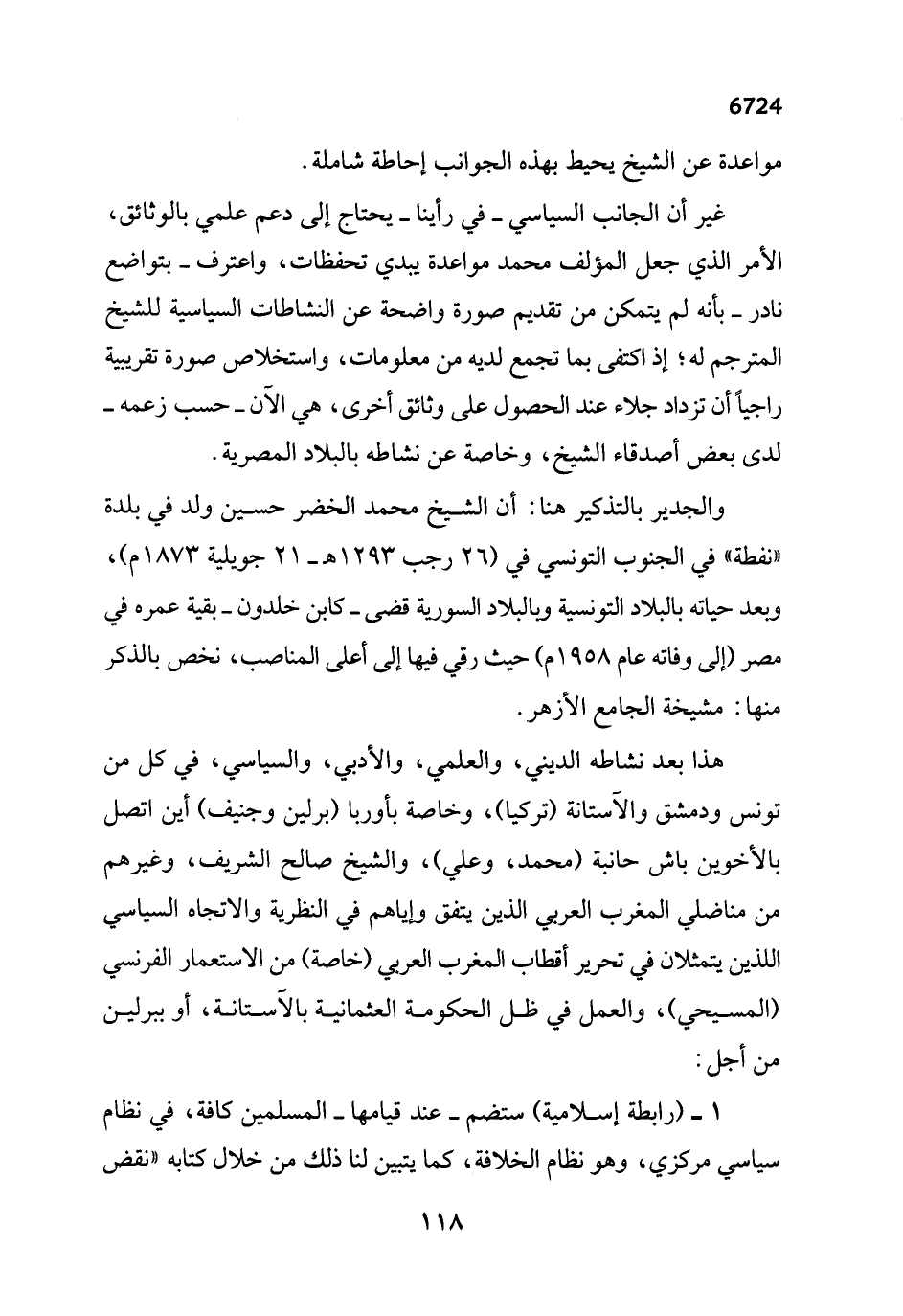 والجدير بالتذكير هنا: أن الشيخ محمد الخضر حسين ولد في بلدة "نفطة" في الجنوب التونسي في (26 رجب 1293 هـ -21 جويلية 1873 م)، وبعد حياته بالبلاد التونسية وبالبلاد السورية قضى -كابن خلدون- بقية عمره في مصر (إلى وفاته عام 1958 م) حيث رقي فيها إلى أعلى المناصب، نخص بالذكر منها: مشيخة الجامع الأزهر.