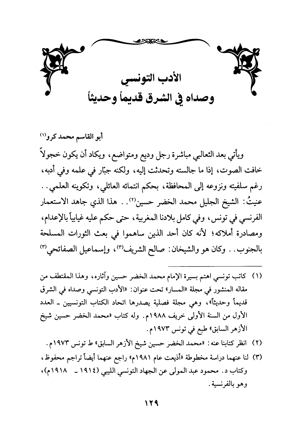 (¬1) كاتب تونسي اهتم بسيرة الإمام محمد الخضر حسين وآثاره، وهذا المقتطف من مقاله المنشور في مجلة "المسار" تحت عنوان: "الأدب التونسي وصداه في الشرق قديماً وحديثاً"، وهي مجلة فصلية يصدرها اتحاد الكتاب التونسيين - العدد الأول من السنة الأولى خريف 1988 م. وله كتاب "محمد الخضر حسين شيخ الأزهر السابق" طبع في تونس 1973 م.