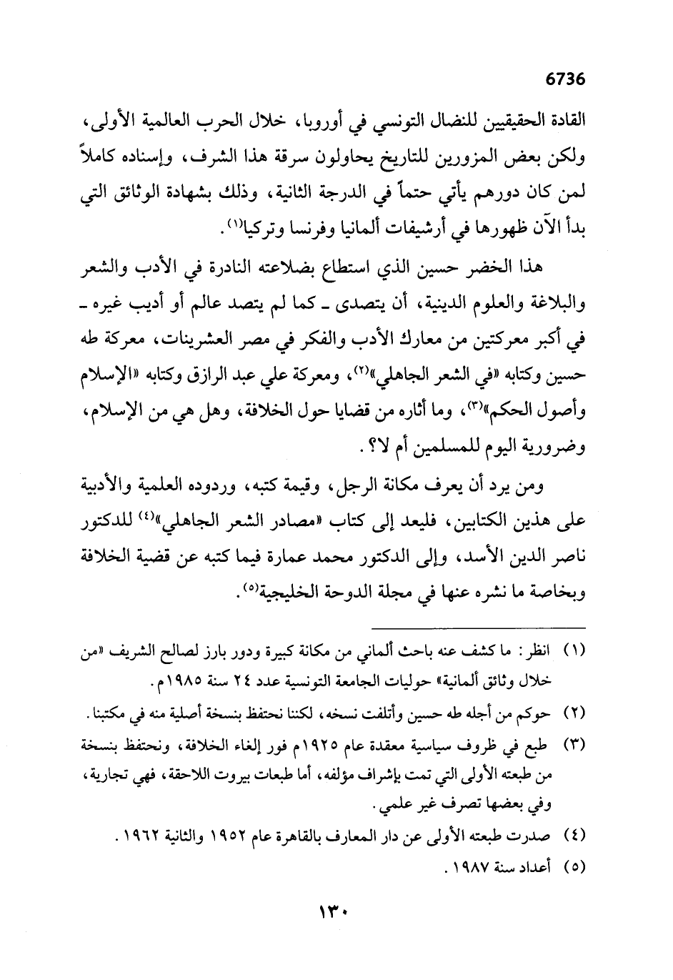 ومن يرد أن يعرف مكانة الرجل، وقيمة كتبه، وردوده العلمية والأدبية على هذين الكتابين، فليعد إلى كتاب "مصادر الشعر الجاهلي" (¬4) للدكتور ناصر الدين الأسد، وإلى الدكتور محمد عمارة فيما كتبه عن قضية الخلافة وبخاصة ما نشره عنها في مجلة الدوحة الخليجية (¬5).