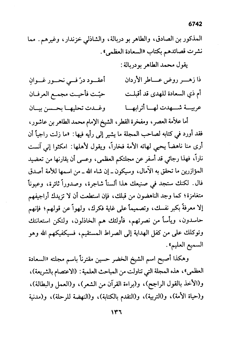 المذكور بن الصادق، والطاهر بو دربالة، والشاذلي خزندار، وغيرهم. مما نشرت قصائدهم بكتاب "السعادة العظمى".