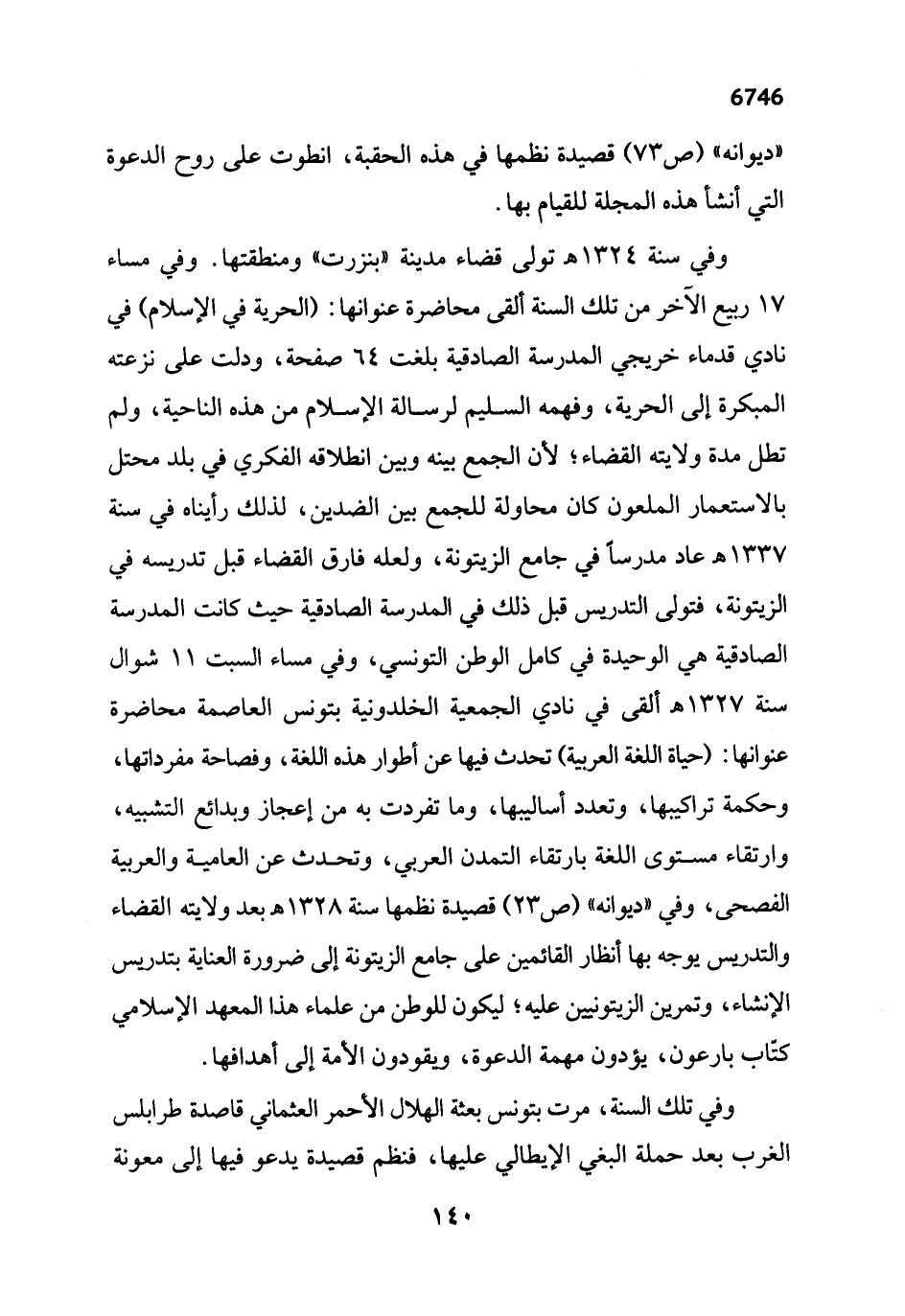 وفي سنة 1324 هـ تولى قضاء مدينة "بنزرت" ومنطقتها. وفي مساء 17 ربيع الآخر من تلك السنة ألقى محاضرة عنوانها: (الحرية في الإسلام) في نادي قدماء خريجي المدرسة الصادقية بلغت 64 صفحة، ودلت على نزعته المبكرة إلى الحرية، وفهمه السليم لرسالة الإسلام من هذه الناحية، ولم تطل مدة ولايته القضاء؛ لأن الجمع بينه وبين انطلاقه الفكري في بلد محتل بالاستعمار الملعون كان محاولة للجمع بين الضدين، لذلك رأيناه في سنة 1337 هـ عاد مدرساً في جامع الزيتونة، ولعله فارق القضاء قبل تدريسه في الزيتونة، فتولى التدريس قبل ذلك في المدرسة الصادقية حيث كانت المدرسة الصادقية هي الوحيدة في كامل الوطن التونسي، وفي مساء السبت 11 شوال سنة 1327 هـ ألقى في نادي الجمعية الخلدونية بتونس العاصمة محاضرة عنوانها: (حياة اللغة العربية) تحدث فيها عن أطوار هذه اللغة، وفصاحة مفرداتها، وحكمة تراكيبها، وتعدد أساليبها، وما تفردت به من إعجاز وبدائع التشبيه، وارتقاء مستوى اللغة بارتقاء التمدن العربي، وتحدث عن العامية والعربية الفصحى، وفي "ديوانه" (ص 23) قصيدة نظمها سنة 1328 هـ بعد ولايته القضاء والتدريس يوجه بها أنظار القائمين على جامع الزيتونة إلى ضرورة العناية بتدريس الإنشاء، وتمرين الزيتونيين عليه؛ ليكون للوطن من علماء هذا المعهد الإسلامي كتّاب بارعون، يؤدون مهمة الدعوة، ويقودون الأمة إلى أهدافها.