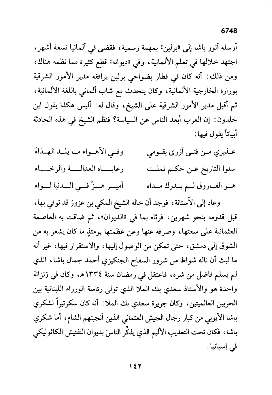 أرسله أنور باشا إلى "برلين" بمهمة رسمية، فقضى في ألمانيا تسعة أشهر، اجتهد خلالها في تعلم الألمانية، وفي "ديوانه" قطع كثيرة مما نظمه هناك، ومن ذلك: أنه كان في قطار بضواحي برلين يرافقه مدير الأمور الشرقية بوزارة الخارجية الألمانية، وكان يتحدث مع شاب ألماني باللغة الألمانية، ثم أقبل مدير الأمور الشرقية على الشيخ، وقال له: أليس هكذا يقول ابن خلدون: إن العرب أبعد الناس عن السياسة؟ فنظم الشيخ في هذه الحادثة أبياتاً يقول فيها: