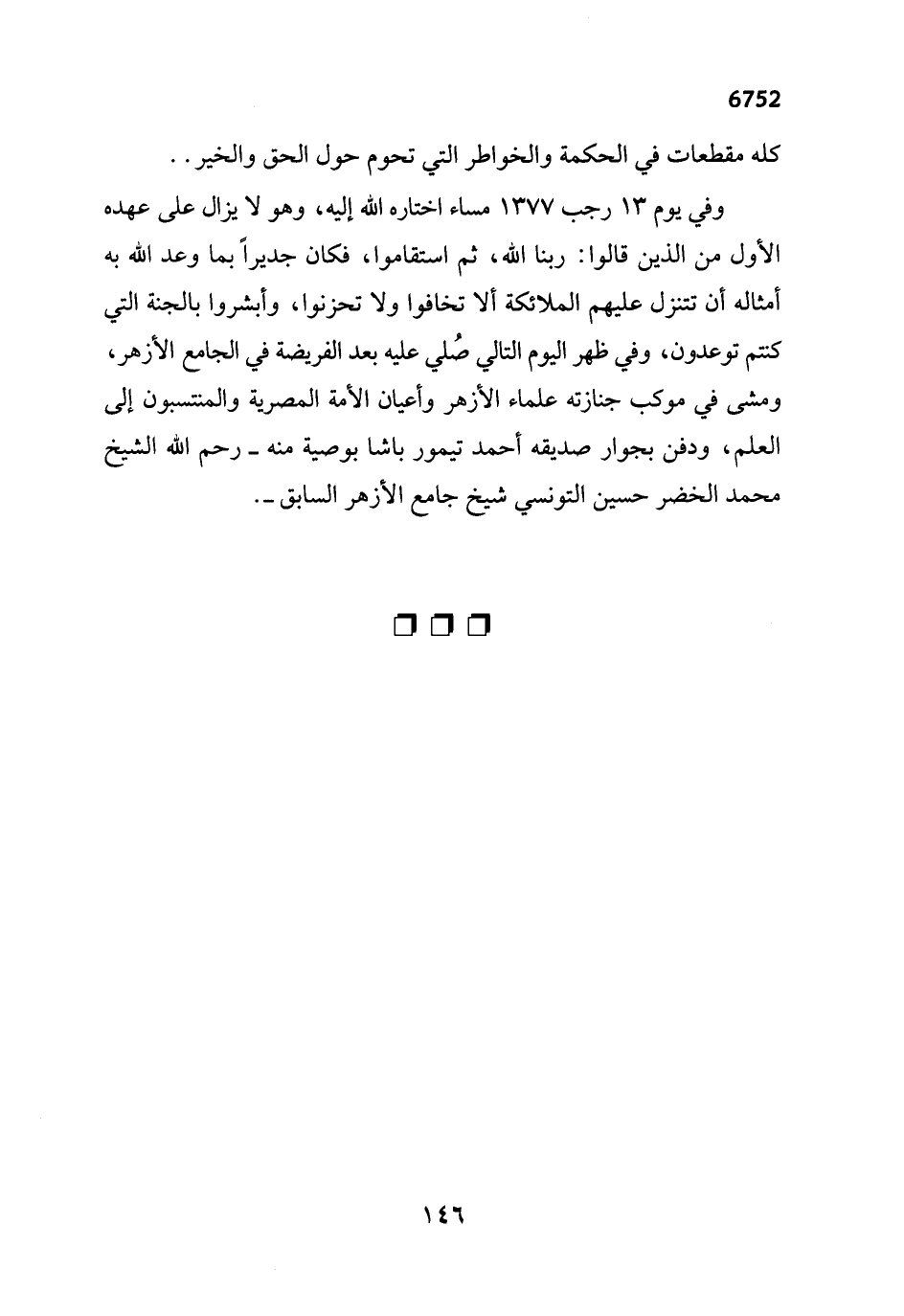 وفي يوم 13 رجب 1377 مساء اختاره الله إليه، وهو لا يزال على عهده الأول من الذين قالوا: ربنا الله، ثم استقاموا، فكان جديراً بما وعد الله به أمثاله أن تتنزل عليهم الملائكة ألا تخافوا ولا تحزنوا، وأبشروا بالجنة التي كنتم توعدون، وفي ظهر اليوم التالي صُلي عليه بعد الفريضة في الجامع الأزهر، ومشى في موكب جنازته علماء الأزهر وأعيان الأمة المصرية والمنتسبون إلى العلم، ودفن بجوار صديقه أحمد تيمور باشا بوصية منه -رحم الله الشيخ محمد الخضر حسين التونسي شيخ جامع الأزهر السابق-.