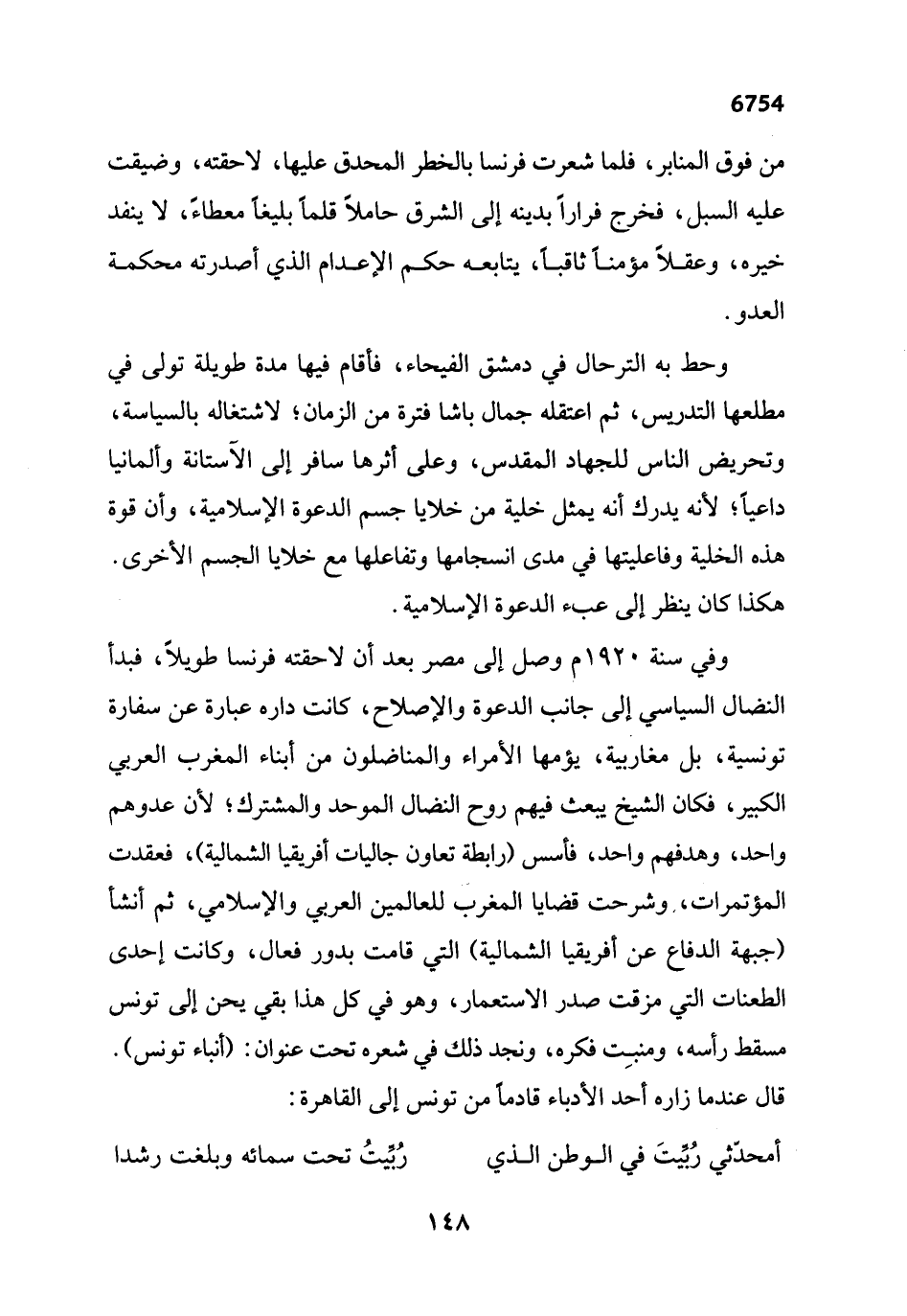 من فوق المنابر، فلما شعرت فرنسا بالخطر المحدق عليها، لاحقته، وضيقت عليه السبل، فخرج فراراً بدينه إلى الشرق حاملاً قلماً بليغاً معطاءً لا ينفد خيره، وعقلاً مؤمناً ثاقباً، يتابعه حكم الإعدام الذي أصدرته محكمة العدو.