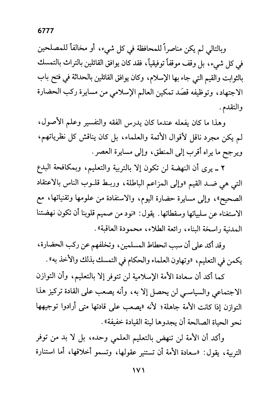 وبالتالي لم يكن مناصراً للمحافظة في كل شيء، أو مخالفاً للمصلحين في كل شيء، بل وقف موقفاً توفيقياً، فقد كان يوافق القائلين بالتراث بالتمسك بالثوابت والقيم التي جاء بها الإسلام، وكان يوافق القائلين بالحداثة في فتح باب الاجتهاد، وتوظيفه قصَد تمكين العالم الإسلامي من مسايرة ركب الحضارة والتقدم.