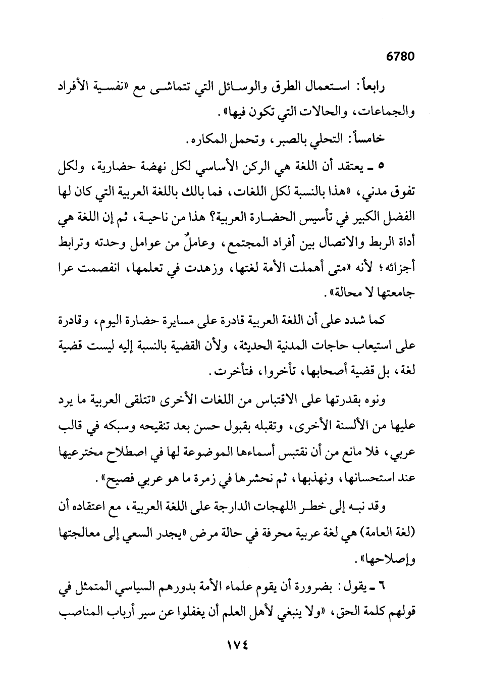 كما شدد على أن اللغة العربية قادرة على مسايرة حضارة اليوم، وقادرة على استيعاب حاجات المدنية الحديثة، ولأن القضية بالنسبة إليه ليست قضية لغة، بل قضية أصحابها، تأخروا، فتأخرت.