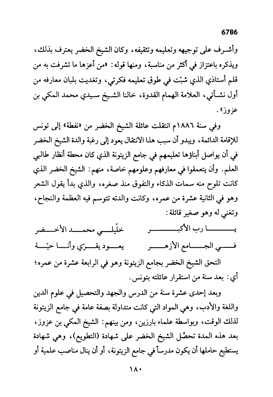 وفي سنة 1886 م انتقلت عائلة الشيخ الخضر من "نفطة" إلى تونس للإقامة الدائمة، ويبدو أن سبب هذا الانتقال يعود إلى رغبة والدة الشيخ الخضر في أن يواصل أبناؤها تعليمهم في جامع الزيتونة الذي كان محطة أنظار طالبي العلم. وأن يتعمقوا في معارفهم وعلومهم خاصة، منهم: الشيخ الخضر الذي كانت تلوح منه سمات الذكاء والتفوق منذ صغره، والذي بدأ يقول الشعر وهو في الثانية عشرة من عمره، وكانت والدته تتوسم فيه العظمة والنجاح، وتغني له وهو صغير قائلة: