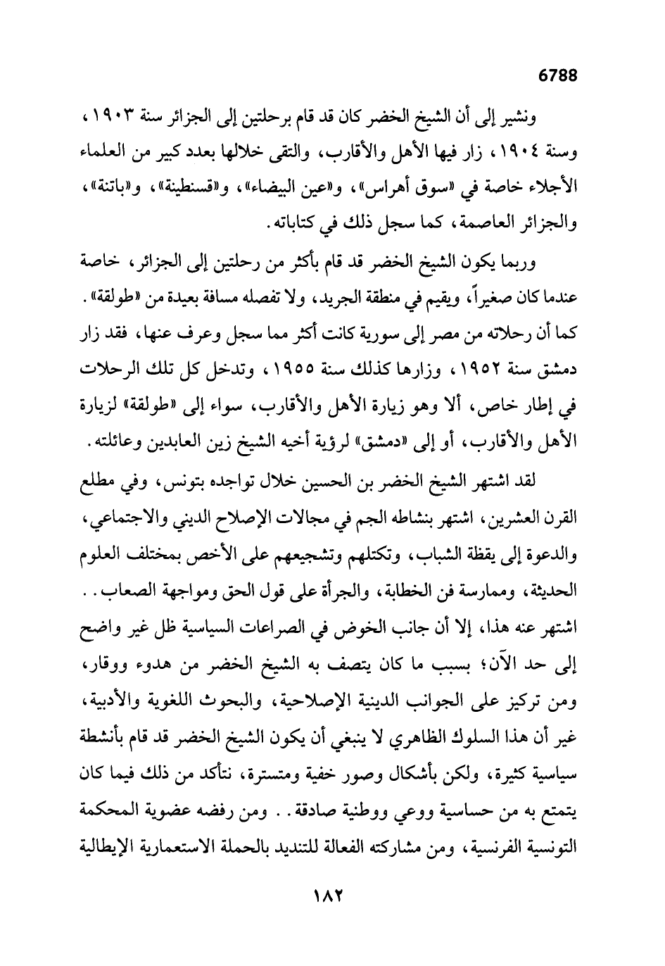 ونشير إلى أن الشيخ الخضر كان قد قام برحلتين إلى الجزائر سنة 1953، وسنة 1904، زار فيها الأهل والأقارب، والتقى خلالها بعدد كبير من العلماء الأجلاء خاصة في "سوق أهراس"، و"عين البيضاء"، و"قسنطينة"، و"باتنة"، والجزائر العاصمة، كما سجل ذلك في كتاباته.