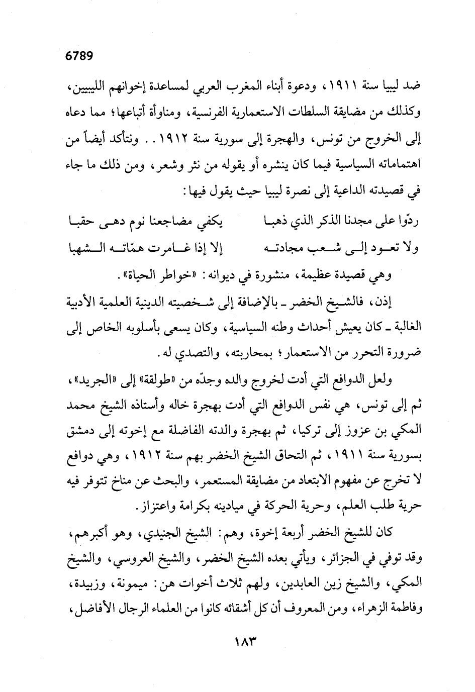 ضد ليبيا سنة 1911، ودعوة أبناء المغرب العربي لمساعدة إخوانهم الليبيين، وكذلك من مضايقة السلطات الاستعمارية الفرنسية، ومناوأة أتباعها؛ مما دعاه إلى الخروج من تونس، والهجرة إلى سورية سنة 1912 .. ونتأكد أيضاً من اهتماماته السياسية فيما كان ينشره أو يقوله من نثر وشعر، ومن ذلك ما جاء في قصيدته الداعية إلى نصرة ليبيا حيث يقول فيها: