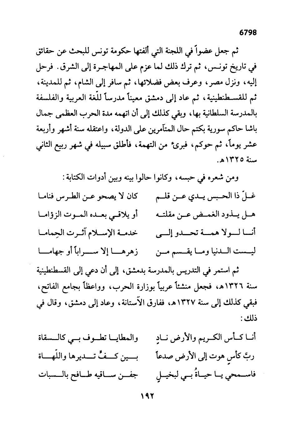 ثم جعل عضواً في اللجنة التي ألفتها حكومة تونس للبحث عن حقائق في تاريخ تونس، ثم ترك ذلك لما عزم على المهاجرة إلى الشرق. فرحل إليه، ونزل مصر، وعرف بعض فضلائها، ثم سافر إلى الشام، ثم للمدينة، ثم للقسطنطينية، ثم عاد إلى دمشق معيناً مدرساً لفغة العربية والفلسفة بالمدرسة السلطانية بها، وبقي كذلك إلى أن اتهمه مدة الحرب العظمى جمال باشا حاكم سورية بكتم حال المتآمرين على الدولة، واعتقله سنة أشهر وأربعة عشر يوماً، ثم حوكم، فبرئ من التهمة، فاطلق سبيله في شهر ربيع الثاني سنة 1325 هـ.