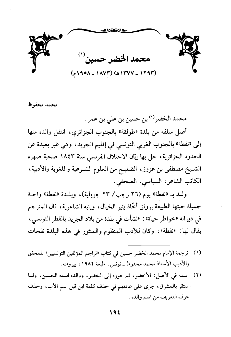 (¬1) ترجمة الإمام محمد الخضر حسين في كتاب "تراجم المؤلفين التونسيين" للمحقق والأديب الأستاذ محمد محفوظ - تونس. طبعة 1982، بيروت.