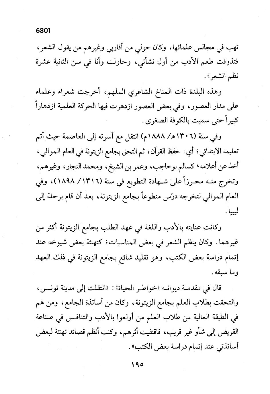 قال في مقدمة ديوانه "خواطر الحياة": "انتقلت إلى مدينة تونس، والتحقت بطلاب العلم بجامع الزيتونة، وكان من أساتذة الجامع، ومن هم في الطبقة العالية من طلاب العلم من أولعوا بالأدب والتنافس في صناعة القريض إلى شأو غير قريب، فاقتفيت أثرهم، وكنت أنظم قصائد تهنئة لبعض أساتذتي عند إتمام دراسة بعض الكتب".
