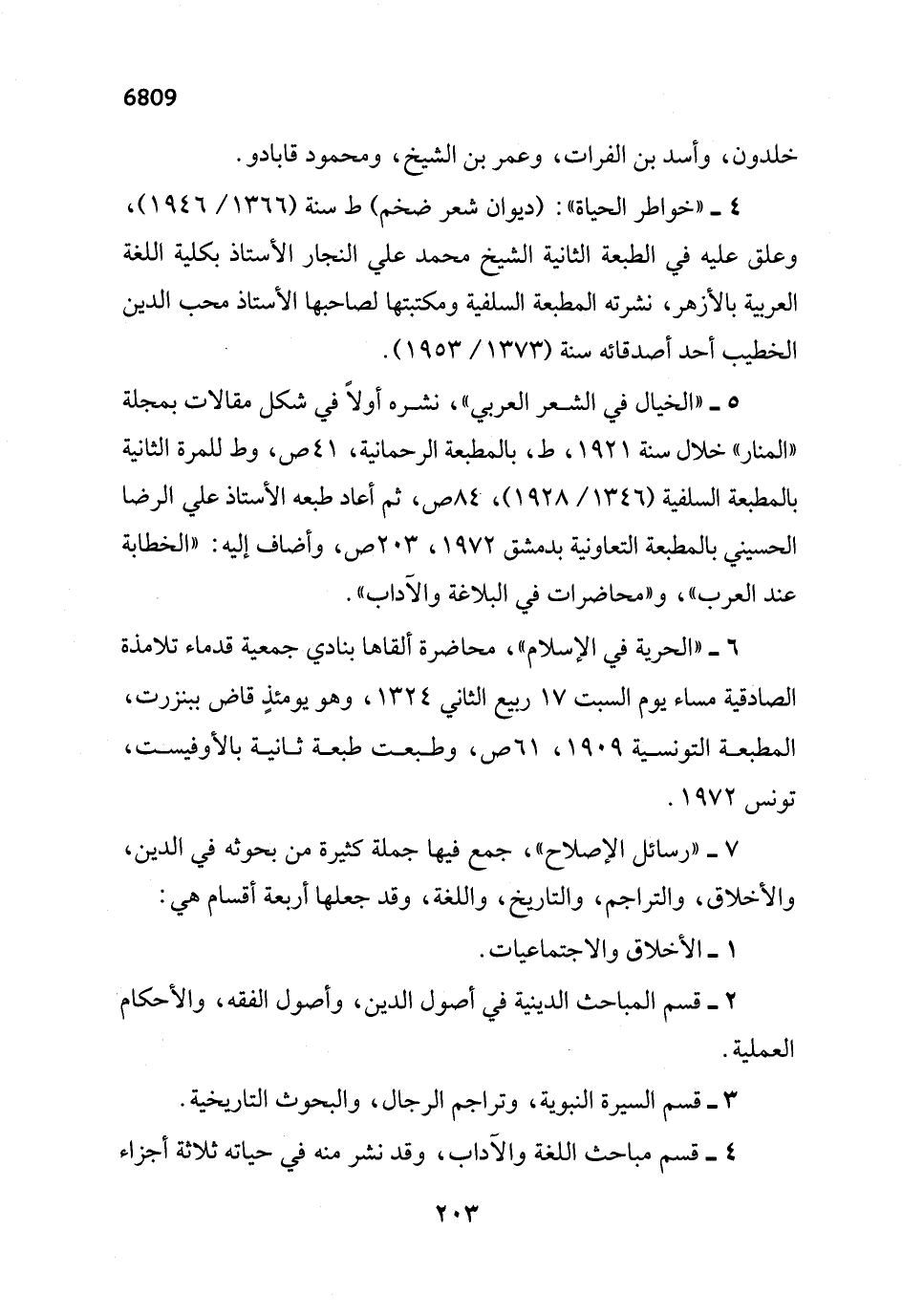 5 - "الخيال في الشعر العربي"، نشره أولاً في شكل مقالات بمجلة "المنار" خلال سنة 1921، ط، بالمطبعة الرحمانية، 41 ص، وط للمرة الثانية بالمطبعة السلفية (1346/ 1928)، -84 ص، ثم أعاد طبعه الأستاذ علي الرضا الحسيني بالمطبعة التعاونية بدمشق 1972، 203 ص، وأضاف إليه: "الخطابة عند العرب"، و"محاضرات في البلاغة والآداب".