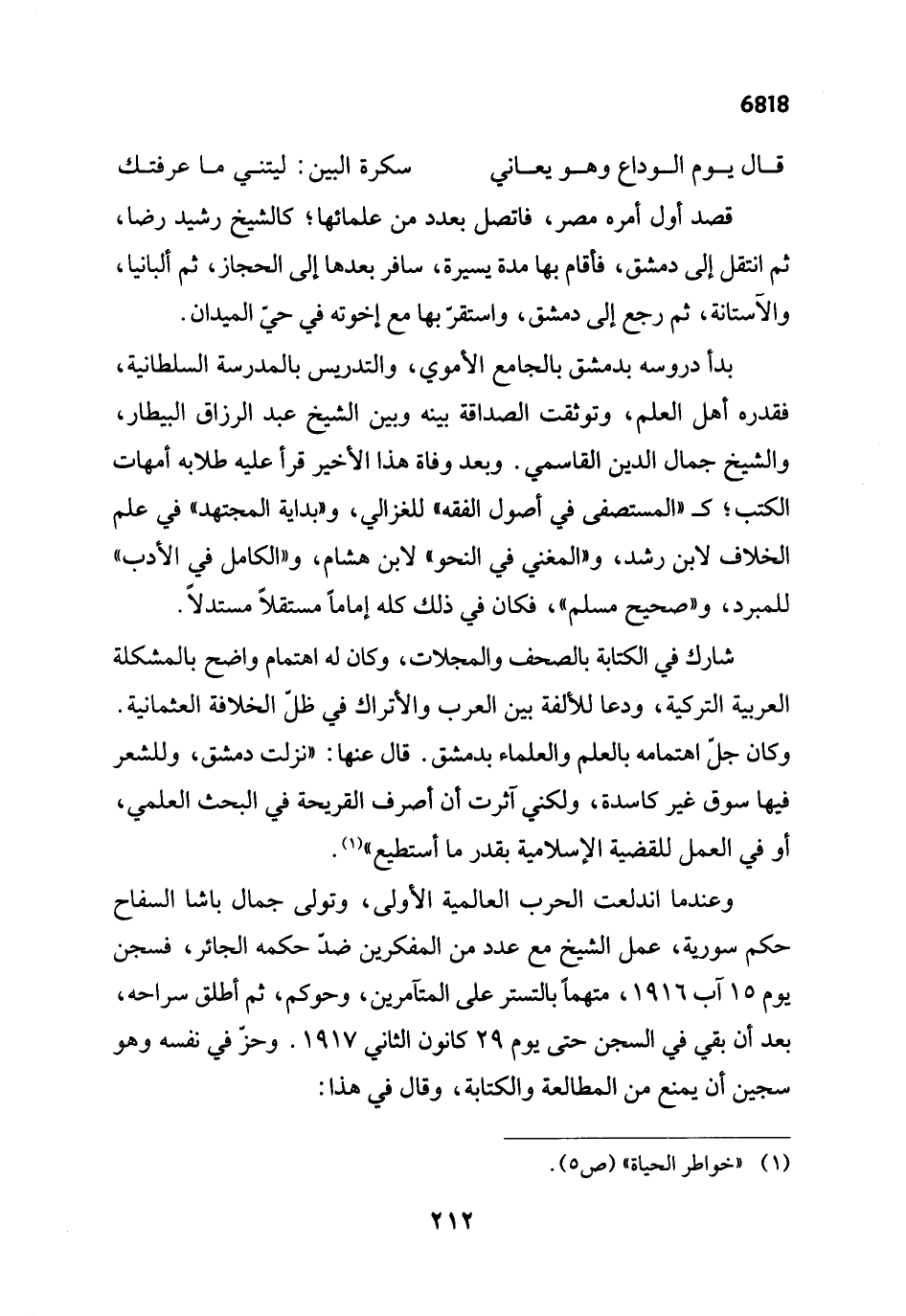وعندما اندلعت الحرب العالمية الأولى، وتولى جمال باشا السفاح حكم سورية، عمل الشيخ مع عدد من المفكرين ضدّ حكمه الجائر، فسجن يوم 15 آب 1916، متهماً بالتستر على المتآمرين، وحوكم، ثم أطلق سراحه، بعد أن بقي في السجن حتى يوم 29 كانون الثاني 1917. وحزّ في نفسه وهو سجين أن يمنع من المطالعة والكتابة، وقال في هذا: