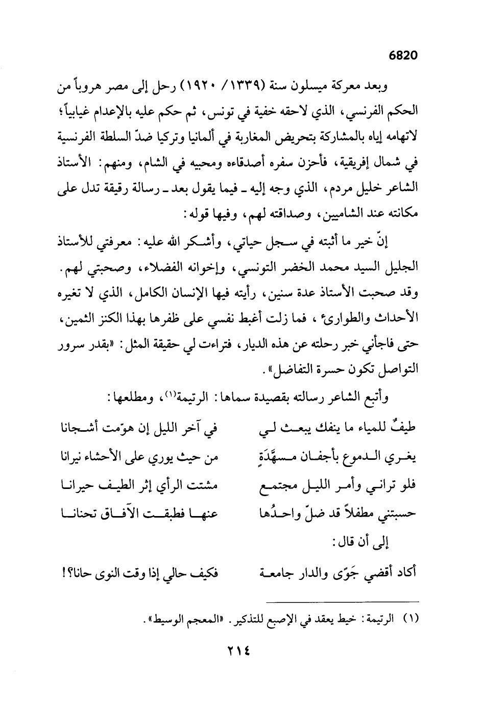 إنّ خير ما أثبته في سجل حياتي، وأشكر الله عليه: معرفتي للأستاذ الجليل السيد محمد الخضر التونسي، وإخوانه الفضلاء، وصحبتي لهم. وقد صحبت الأستاذ عدة سنين، رأيته فيها الإنسان الكامل، الذي لا تغيره الأحداث والطوارئ، فما زلت أغبط نفسي على ظفرها بهذا الكنز الثمين، حتى فاجأني خبر رحلته عن هذه الديار، فتراءت لي حقيقة المثل: "بقدر سرور التواصل تكون حسرة التفاضل".