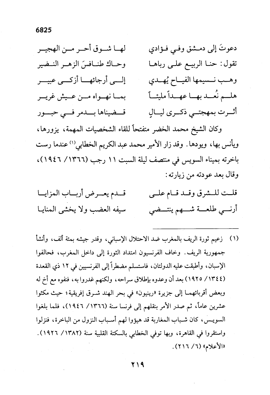 وكان الشيخ محمد الخضر متفتحاً للقاء الشخصيات المهمة، يزورها، ويأنس بها، ويودها. وقد زار الأمير محمد عبد الكريم الخطابي (¬1) عندما رست باخرته بميناء السويس في منتصف ليلة السبت 11 رجب (1366/ 1946)، وقال بعد عودته من زيارته: