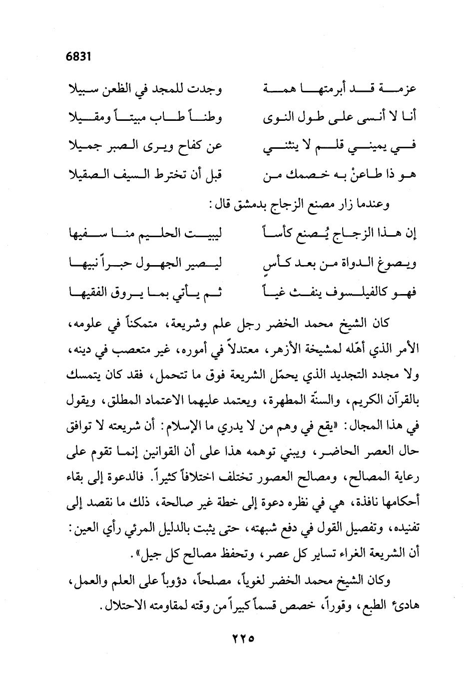 وكان الشيخ محمد الخضر لغوياً، مصلحاً، دؤوباً على العلم والعمل، هادئ الطبع، وقوراً، خصص قسماً كبيراً من وقته لمقاومته الاحتلال.