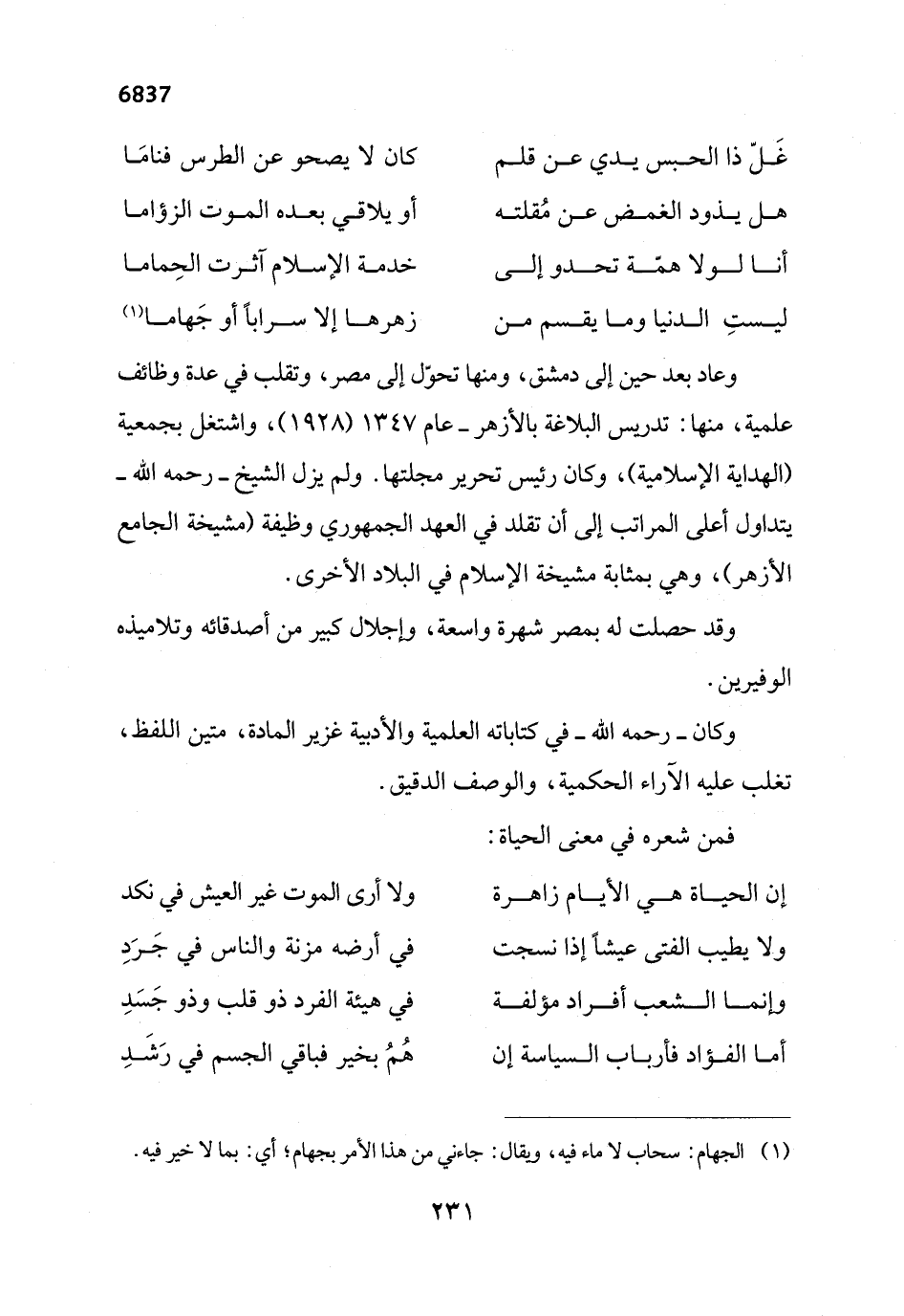 وعاد بعد حين إلى دمشق، ومنها تحوّل إلى مصر، وتقلب في عدة وظائف علمية، منها: تدريس البلاغة بالأزهر - عام 1347 (1928)، واشتغل بجمعية (الهداية الإسلامية)، وكان رئيس تحرير مجلتها. ولم يزل الشيخ -رحمه الله- يتداول أعلى المراتب إلى أن تقلد في العهد الجمهوري وظيفة (مشيخة الجامع الأزهر)، وهي بمثابة مشيخة الإسلام في البلاد الأخرى.