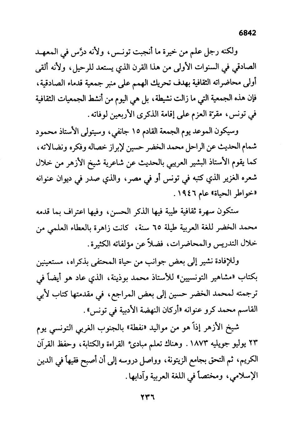 وسيكون الموعد يوم الجمعة القادم 15 جانفي، وسيتولى الأستاذ محمود شمام الحديث عن الراحل محمد الخضر حسين لإبراز خصاله وفكره ونضالاته، كما يقوم الأستاذ البشير العريبي بالحديث عن شاعرية شيخ الأزهر من خلال شعره الغزير الذي كتبه في تونس أو في مصر، والذي صدر في ديوان عنوانه "خواطر الحياة" عام 1946.