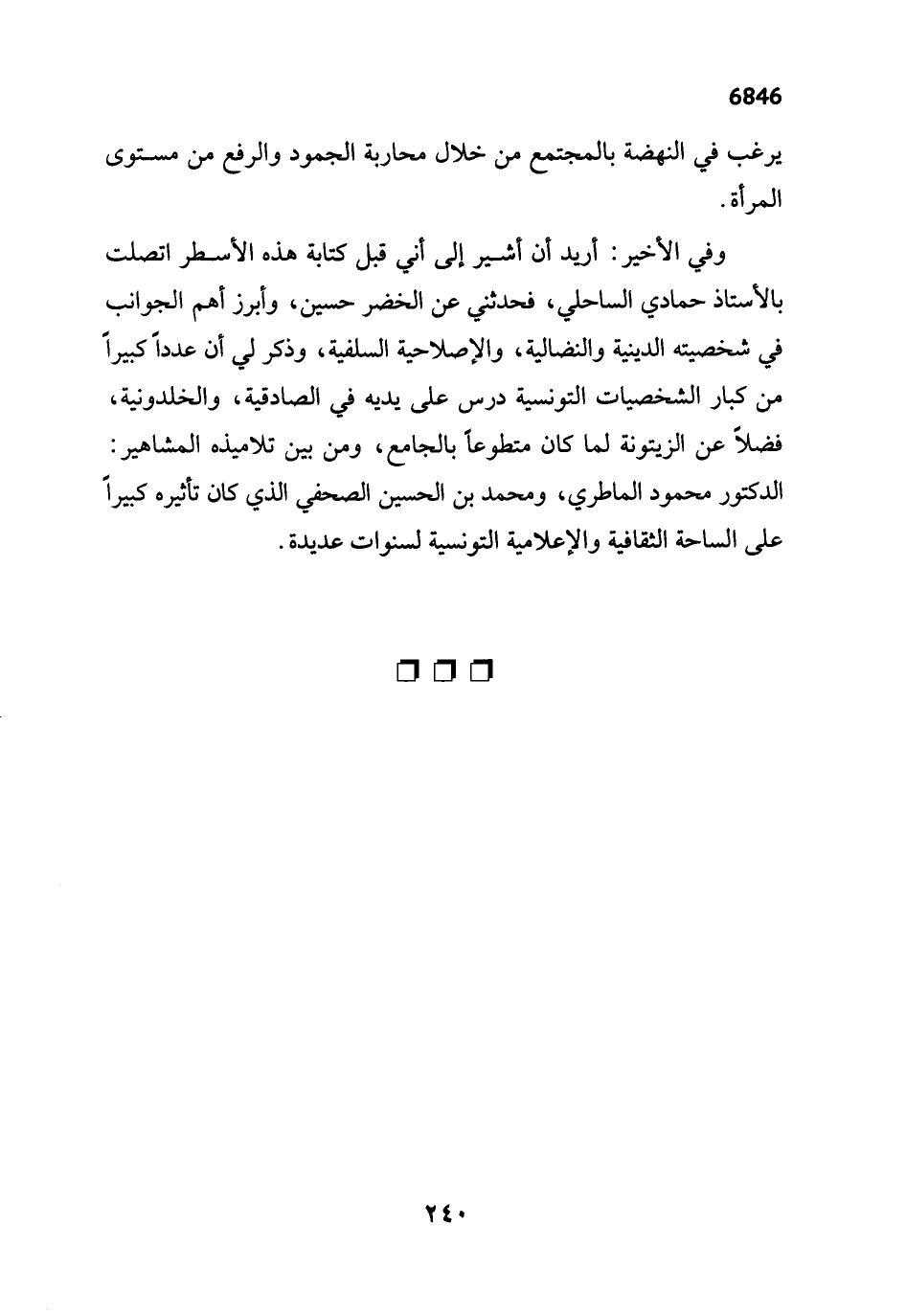 وفي الأخير: أريد أن أشير إلى أني قبل كتابة هذه الأسطر اتصلت بالأستاذ حمادي الساحلي، فحدثني عن الخضر حسين، وأبرز أهم الجوانب في شخصيته الدينية والنضالية، والإصلاحية السلفية، وذكر لي أن عدداً كبيراً من كبار الشخصيات التونسية درس على يديه في الصادقية، والخلدونية، فضلاً عن الزيتونة لما كان متطوعاً بالجامع، ومن بين تلاميذه المشاهير: الدكتور محمود الماطري، ومحمد بن الحسين الصحفي الذي كان تأثيره كبيراً على الساحة الثقافية والإعلامية التونسية لسنوات عديدة.
