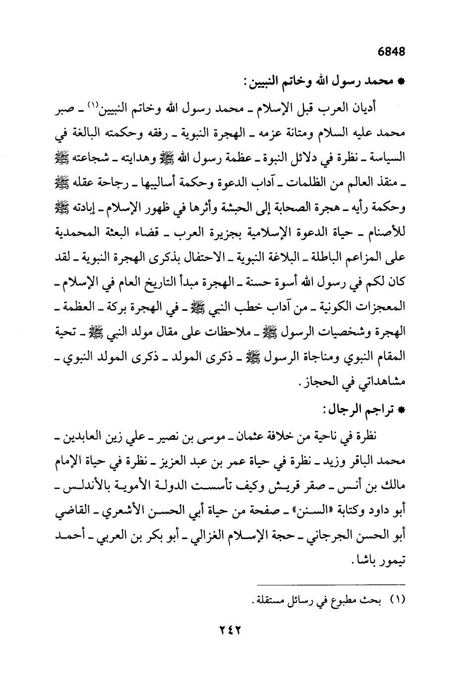 أديان العرب قبل الإسلام - محمد رسول الله وخاتم النبيين (¬1) - صبر محمد عليه السلام ومتانة عزمه - الهجرة النبوية - رفقه وحكمته البالغة في السياسة - نظرة في دلائل النبوة - عظمة رسول الله - صلى الله عليه وسلم - وهدايته - شجاعته - صلى الله عليه وسلم - منقذ العالم من الظلمات - آداب الدعوة وحكمة أساليبها - رجاحة عقله - صلى الله عليه وسلم - وحكمة رأيه - هجرة الصحابة إلى الحبشة وأثرها في ظهور الإسلام - إبادته - صلى الله عليه وسلم - للأصنام - حياة الدعوة الإسلامية بجزيرة العرب - قضاء البعثة المحمدية على المزاعم الباطلة - البلاغة النبوية - الاحتفال بذكرى الهجرة النبوية - لقد كان لكم في رسول الله أسوة حسنة - الهجرة مبدأ التاريخ العام في الإسلام - المعجزات الكونية - من آداب خطب النبي - صلى الله عليه وسلم - في الهجرة بركة - العظمة - الهجرة وشخصيات الرسول - صلى الله عليه وسلم - ملاحظات على مقال مولد النبي - صلى الله عليه وسلم - تحية المقام النبوي ومناجاة الرسول - صلى الله عليه وسلم - ذكرى المولد - ذكرى المولد النبوي - مشاهداتي في الحجاز.