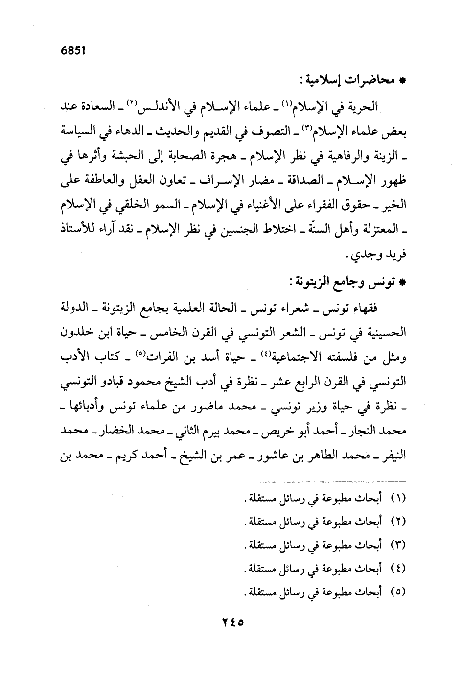 فقهاء تونس - شعراء تونس - الحالة العلمية بجامع الزيتونة- الدولة الحسينية في تونس - الشعر التونسي في القرن الخامس - حياة ابن خلدون ومثل من فلسفته الاجتماعية (¬4) - حياة أسد بن الفرات (¬5) - كتاب الأدب التونسي في القرن الرابع عشر - نظرة في أدب الشيخ محمود قبادو التونسي - نظرة في حياة وزير تونسي - محمد ماضور من علماء تونس وأدبائها - محمد النجار - أحمد أبو خريص - محمد بيرم الثاني - محمد الخضار - محمد النيفر - محمد الطاهر بن عاشور - عمر بن الشيخ - أحمد كريم - محمد بن
