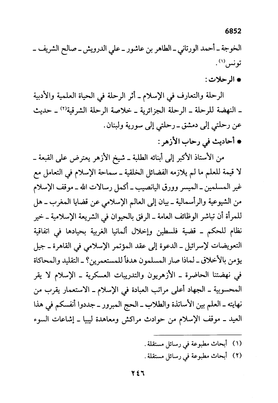 الرحلة والتعارف في الإسلام - أثر الرحلة في الحياة العلمية والأدبية - النهضة للرحلة - الرحلة الجزائرية - خلاصة الرحلة الشرقية (¬2) - حديث عن رحلتي إلى دمشق - رحلتي إلى سورية ولبنان.