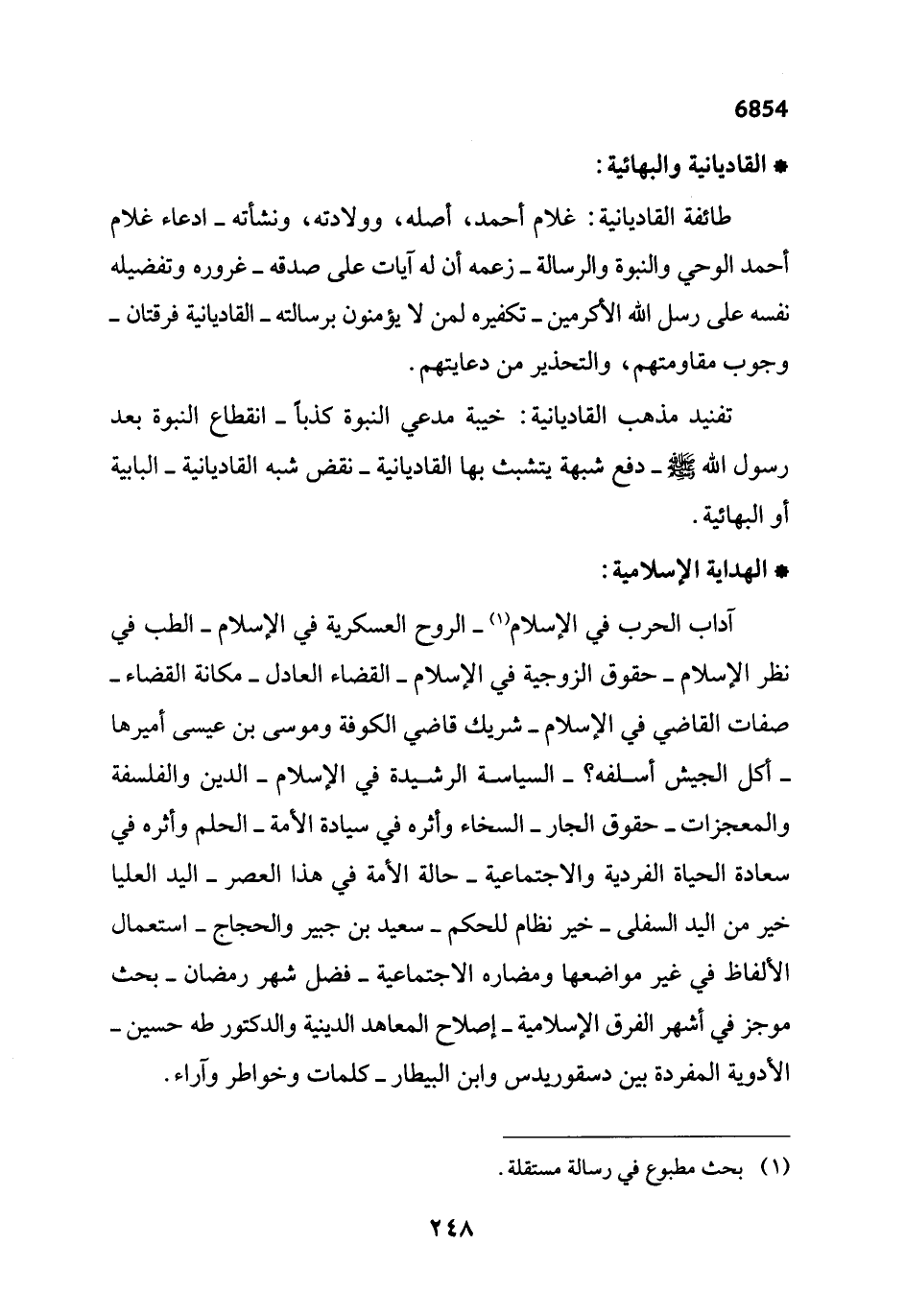 آداب الحرب في الإسلام (¬1) - الروح العسكرية في الإسلام - الطيب في نظر الإسلام - حقوق الزوجية في الإسلام - القضاء العادل - مكانة القضاء - صفات القاضي في الإسلام - شريك قاضي الكوفة وموسى بن عيسى أميرها - كل الجيش أسلفه؟ - السياسة الرشيدة في الإسلام - الدين والفلسفة والمعجزات - حقوق الجار - السخاء وأثره في سيادة الأمة - الحلم وأثره في سعادة الحياة الفردية والاجتماعية - حالة الأمة في هذا العصر - اليد العليا خير من اليد السفلى - خير نظام للحكم - سعيد بن جبير والحجاج - استعمال الألفاظ في غير مواضعها ومضاره الاجتماعية - فضل شهر رمضان - بحث موجز في أشهر الفرق الإسلامية - إصلاح المعاهد الدينية والدكتور طه حسين - الأدوية المفردة بين دسقوريدس وابن البيطار - كلمات وخواطر وآراء.