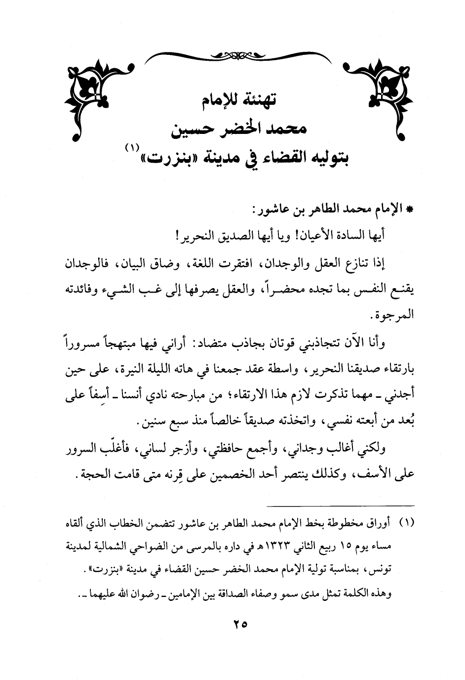 تهنئة للإمام محمد الخضر حسين بتوليه القضاء في مدينة "بنزرت" (¬1)