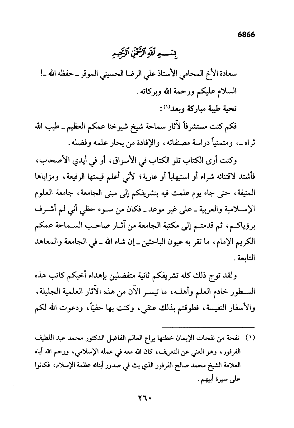 ولقد توج ذلك كله تشريفكم ثانية متفضلين بإهداء أخيكم كاتب هذه السطور خادم العلم وأهله، ما تيسر الاَن من هذه الآثار العلمية الجليلة، والأسفار النفيسة، فطوقتم بذلك عنقي، وكنت بها حفيّاً، ودعوت الله لكم