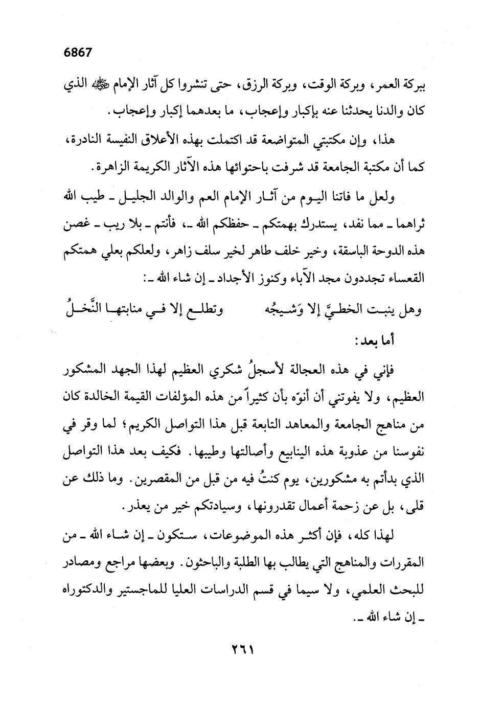 فإني في هذه العجالة لأسجلُ شكري العظيم لهذا الجهد المشكور العظيم، ولا يفوتني أن أنوّه بأن كثيراً من هذه المؤلفات القيمة الخالدة كان من مناهج الجامعة والمعاهد التابعة قبل هذا التواصل الكريم؛ لما وقر في نفوسنا من عذوبة هذه الينابيع وأصالتها وطيبها. فكيف بعد هذا التواصل الذي بدأتم به مشكورين، يوم كنتُ فيه من قبل من المقصرين. وما ذلك عن قلى، بل عن زحمة أعمال تقدرونها، وسيادتكم خير من يعذر.