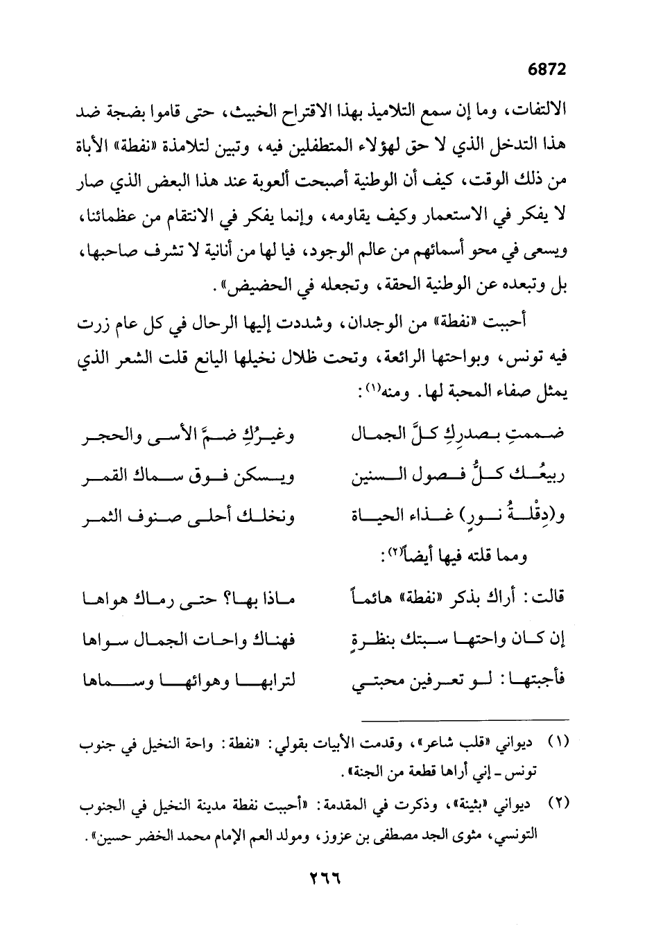 أحببت "نفطة" من الوجدان، وشددت إليها الرحال في كل عام زرت فيه تونس، وبواحتها الرائعة، وتحت ظلال نخيلها اليانع قلت الشعر الذي يمثل صفاء المحبة لها. ومنه (¬1):