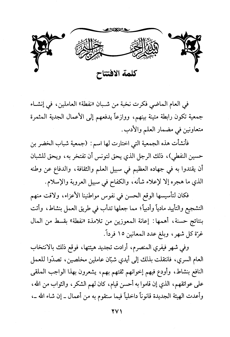 فأنشأت هذه الجمعية التي اختارت لها اسم: (جمعية شباب الخضر بن حسين النفطي)، ذلك الرجل الذي يحق لتونس أن تفتخر به، ويحق للشبان أن يقتدوا به في جهاده العظيم في سبيل العلم والثقافة، والدفاع عن وطنه الذي ما هجره إلا لإعلاء شأنه، والكفاح في سبيل العروبة والإسلام.